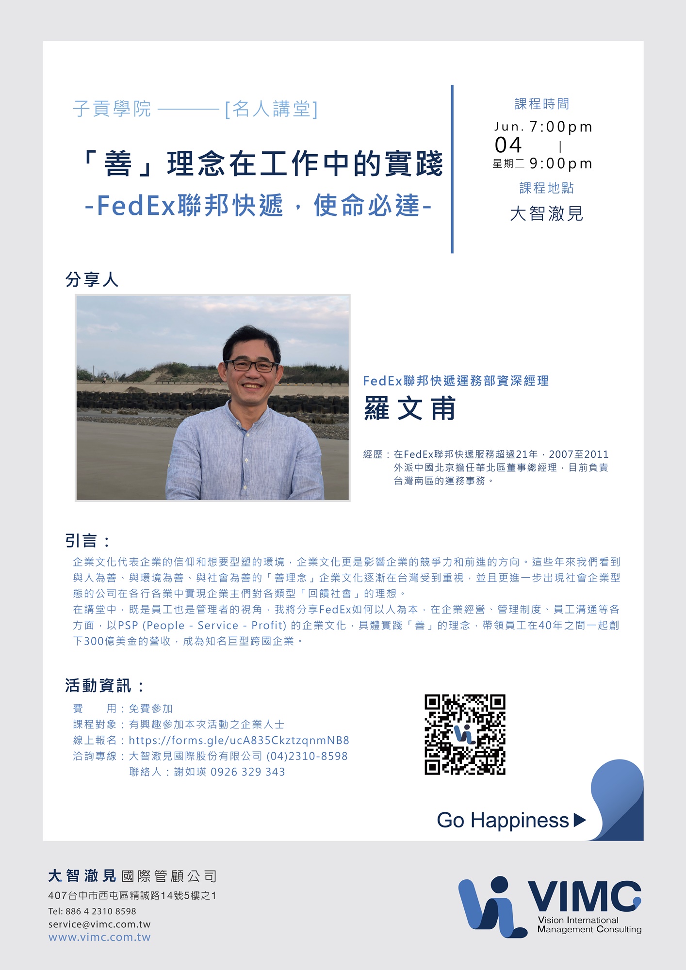 在講堂中,既是員工也是管理者的視角,我將分享FedEx如何以人為本,在企業經營、管理制度、員工溝通等各方面,以PSP (People - Service - Profit) 的企業文化,具體實踐「善」的理念,帶領員工在40年之間一起創下300億美金的營收,成為知名巨型跨國企業。