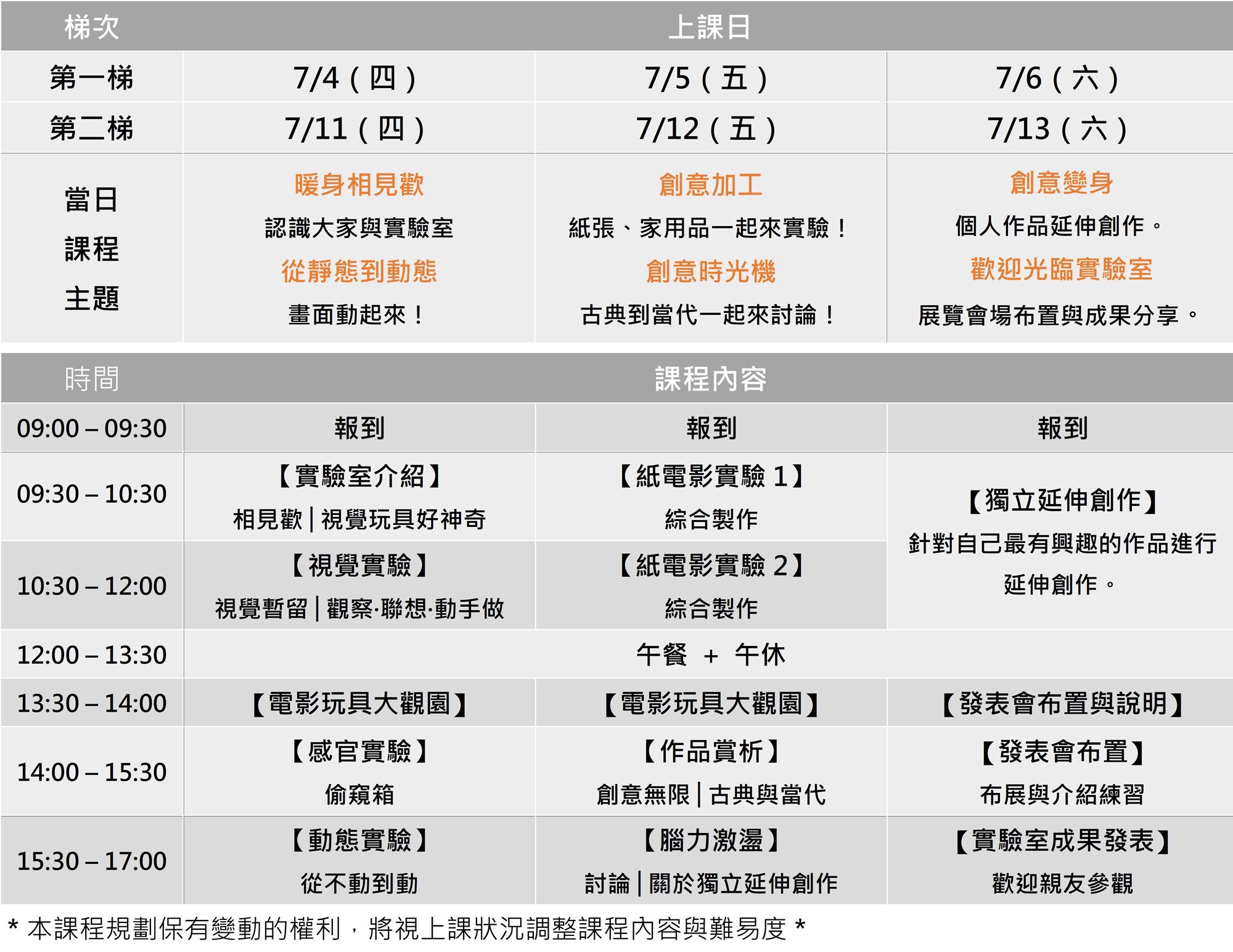 『紙電影實驗室』以10-12歲學童為對象,在3天的課程中,將帶領小朋友透過不同角度、表現手法,利用「紙張」、「生活用品」、「文具」等媒材來實驗創作,原來畫面會動起來不是只有卡通、電影或網路影片,而是有更多的可能性喔!最後一天下午,歡迎親友蒞臨『實驗室發表會』,學員將親自擔任小小解說員,與參訪來賓們分享創作過程的想像力實驗!