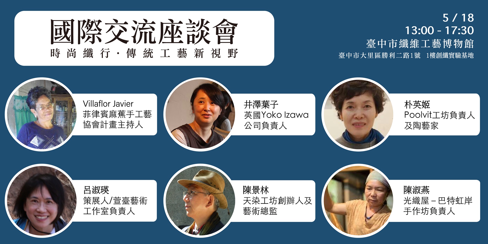 這次展覽將於108年5月18日至11月3日假臺中市纖維工藝博物館1樓展廳展出,並於5月18日下午1點舉辦「時尚纖行‧傳統工藝新視野──國際交流座談會」,會中邀請國內外共6位講者共同探討與交流,菲律賓麻蕉手工藝協會計畫主持人Villaflor Javier、英國Yoko Izawa公司負責人Yoko Izawa井澤葉子、韓國陶藝家朴英姬女士、策展人與萱臺藝術工作室負責人呂淑瑛老師、天染工坊負責人陳景林老師、纖維藝術創作者陳淑燕老師,期待透過不同國際觀與工藝的交流,激盪出新的火花與視野。同時,「五色-韓國天然染色特展」以及「遇見臺中Encounter-2019時尚產學交流展」也將分別於5月18日及5月31日一同開展,歡迎各位朋友一同來參加臺中市纖維工藝博物館熱鬧的時尚饗宴!