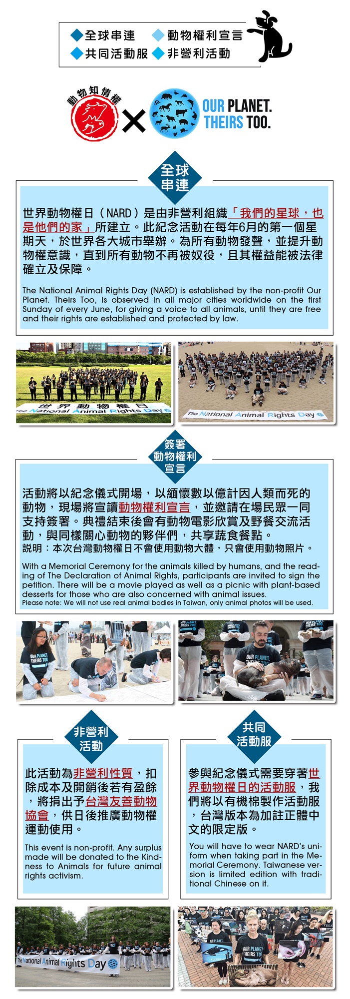 今年同步與台北市和高雄市舉行世界動物權日的國家有:美國、加拿大、英國、德國、法國、丹麥、西班牙、印度、澳洲、 菲律賓、 越南、中國。台北市和高雄市是第二次參與這場國際大型串連活動,誠摯的邀請所有愛護動物的好朋友一同參與同歡。