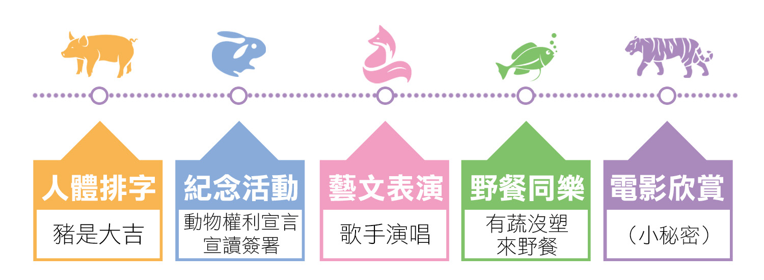 各式活動包含可愛動物互動、草地音樂會、親子電影欣賞和流浪動物送養會等,非常適合大朋友和小朋友在假日的午後與我們渡過一段歡樂的時光,並一同創造一段珍惜生命和友善動物的生活學習體驗。