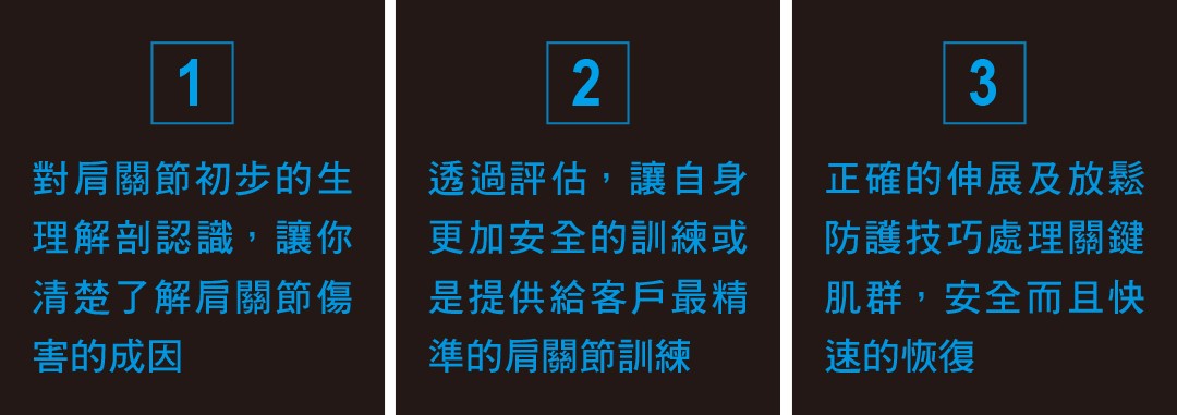 對肩關節來說,在大範圍的活動角度需要有良好的肩關節穩定性去做支撐,其中肩胛骨的位置與旋轉肌群是否力量平衡皆會影響肩關節的動作表現與傷害預防,在了解功能解剖與生物力學後,課程中會再教您如何透過簡易的評估,讓自身更加安全的訓練或是提供給客戶最精準的肩關節訓練。