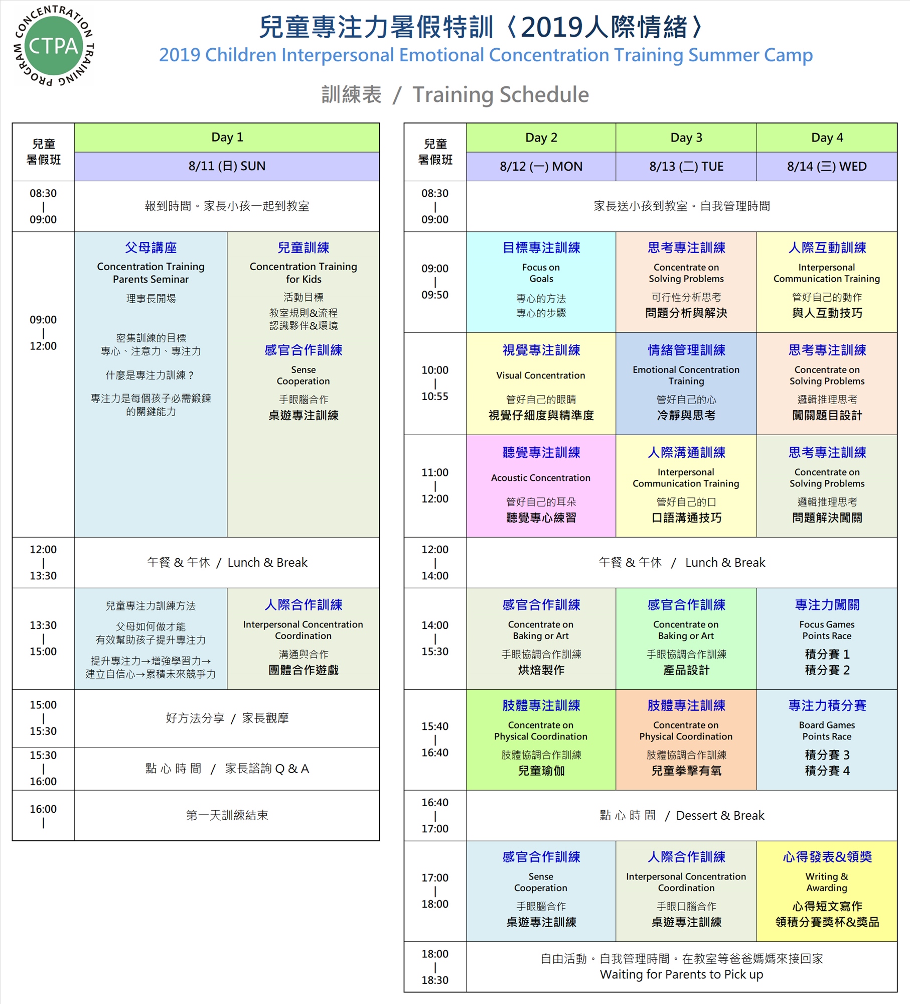 ※活動第一日分兩個教室雙軌同時進行:小孩課&大人課,活動第2~4日只有小孩受訓。