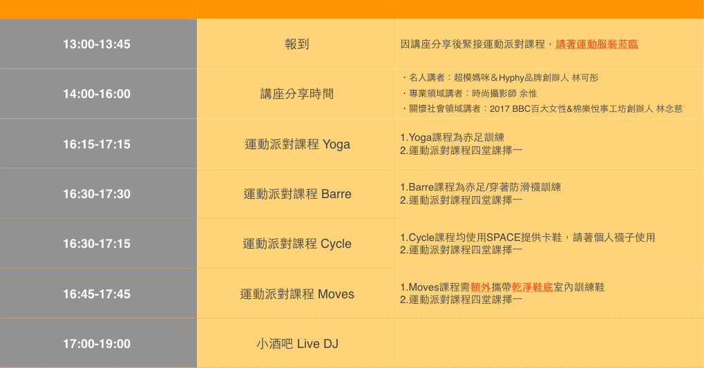 當天更安排獨特魅力的SPACE全能導師以音樂為靈感,帶妳挑戰一堂妳過去不敢面對的運動項目,活動中段隊伍將分散為四組:瘋狂的Cycle、優雅的Barre、凍齡的Yoga、性感的Moves,最後一起在Live DJ的現場陪伴裡釋放自我、交談、彼此充電。