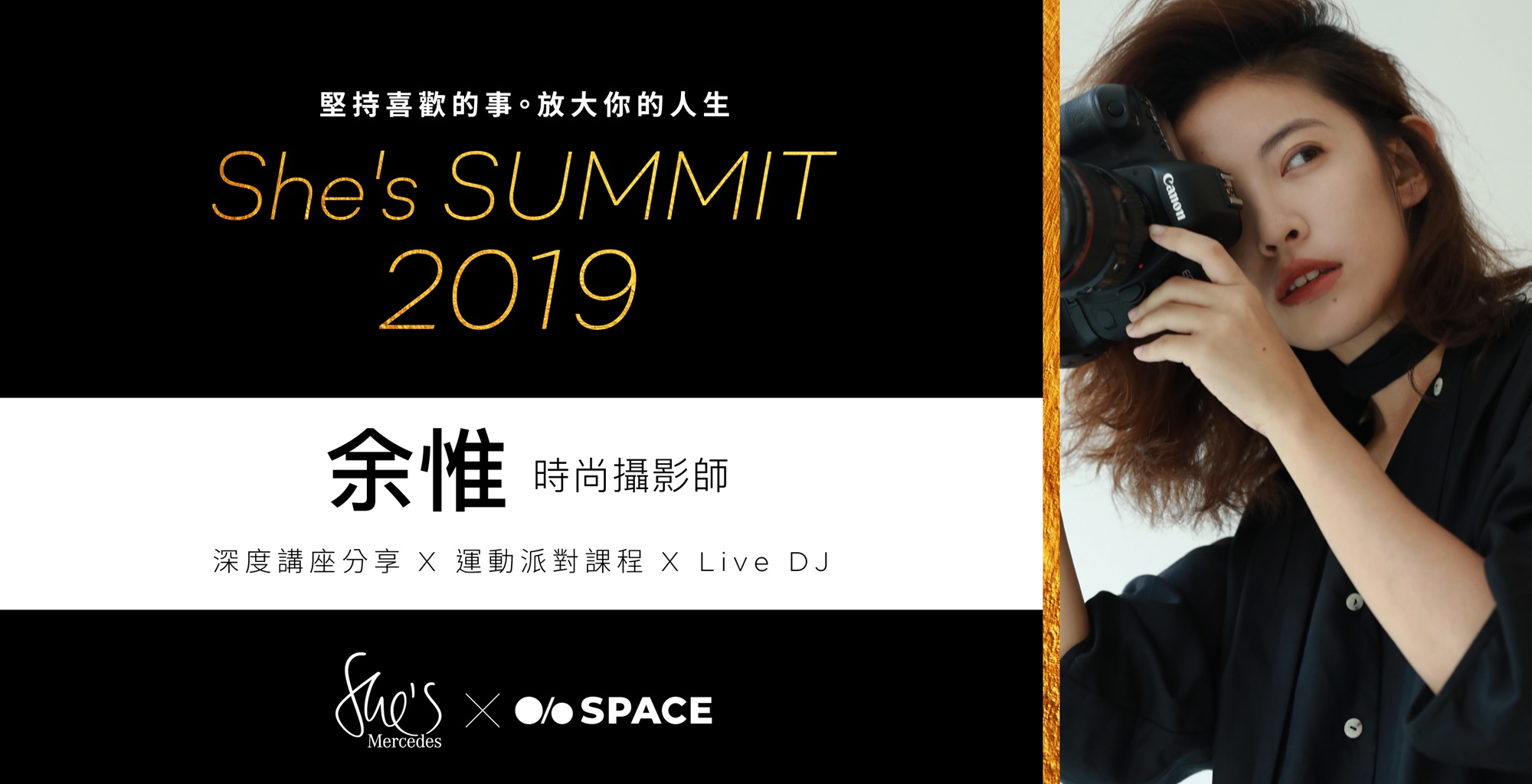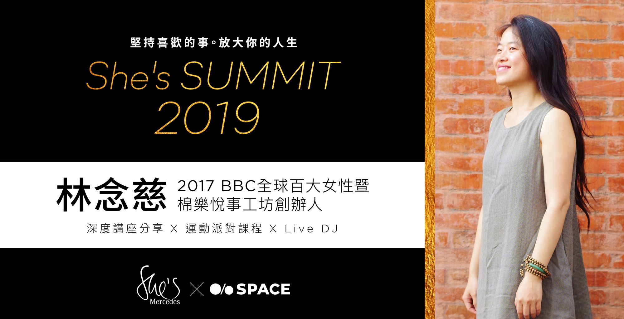SPACE跟She's Mercedes今年共同舉辦She’s Summit豐富的三段式活動,結合講座分享、運動派對、Live DJ小酒吧! 從午後到黃昏,一起來聽當今頗具影響力的超模媽咪暨Hyphy品牌創辦人林可彤 X 時尚攝影師余惟X 2017 BBC全球百大女性之一暨棉樂悅事工坊創辦人林念慈說故事,告訴妳她們人生道路上發現的內在驚喜,而驚喜又怎麼的串接成一系列有影響力的作為,製造更多驚喜和美好給別人;希望來到論壇的每一位聽者在人生中發現新契機,無論在工作職場上、家庭裡、姐妹淘中自信扮演自己的角色。