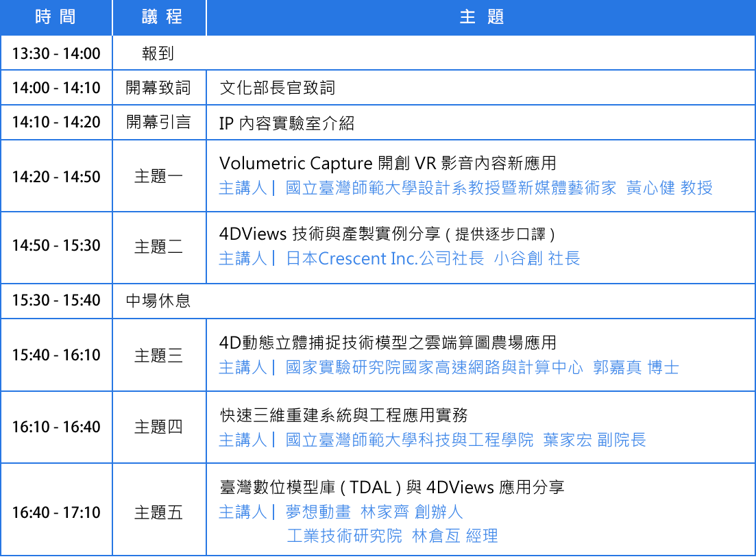 因應潮流趨勢,文化部預計今年引進目前國際間十分受到關注的動態立體虛擬攝影系統,並委託工業技術研究院執行「IP 內容實驗室」。為推廣動態立體捕捉技術,「IP 內容實驗室」特別舉辦「4D 內容產製技術研討會」邀請來自國內、外的專家,從動態立體捕捉技術、 VR、三維重建、算圖農場等不同的應用模式,進行專業分享,免費參加,僅此一場,名額限定,報名從速。