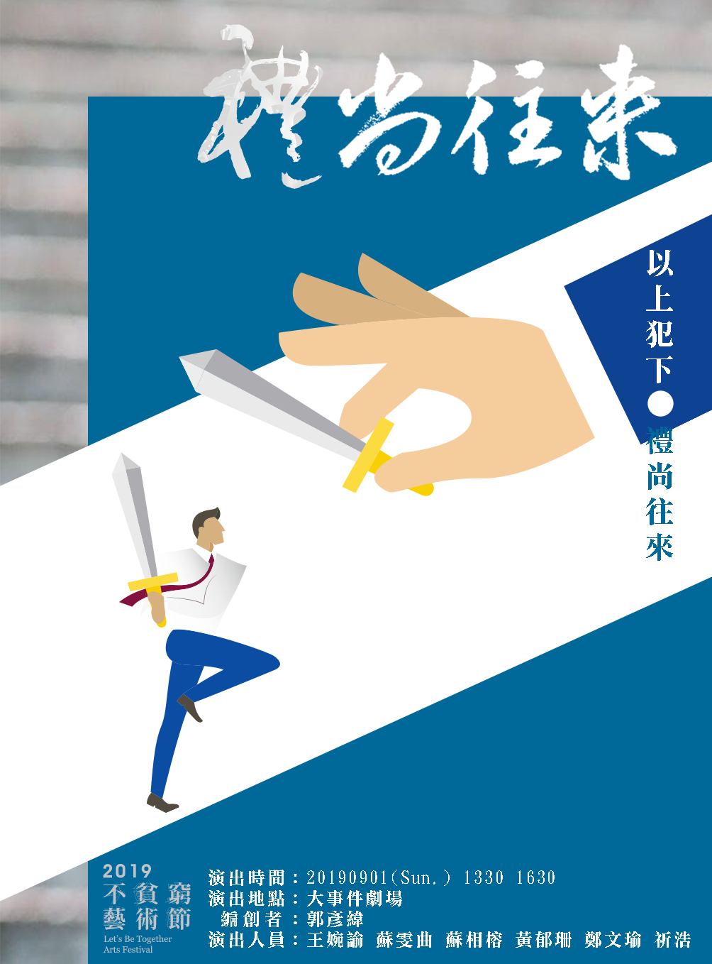 而下半場《以上犯下》更加的探討「身份」的關係,對於長輩、上司等等這些上位者們以自己的權利、輩分、地位,對下位者無止境的壓迫與要脅。我們常說敬老尊賢卻被很多長輩以此倚老賣老,認為一切的要求都是理所當然,對於這樣的壓迫,我們又能做些什麼呢?歡迎來跟我們一起《禮尚往來》。