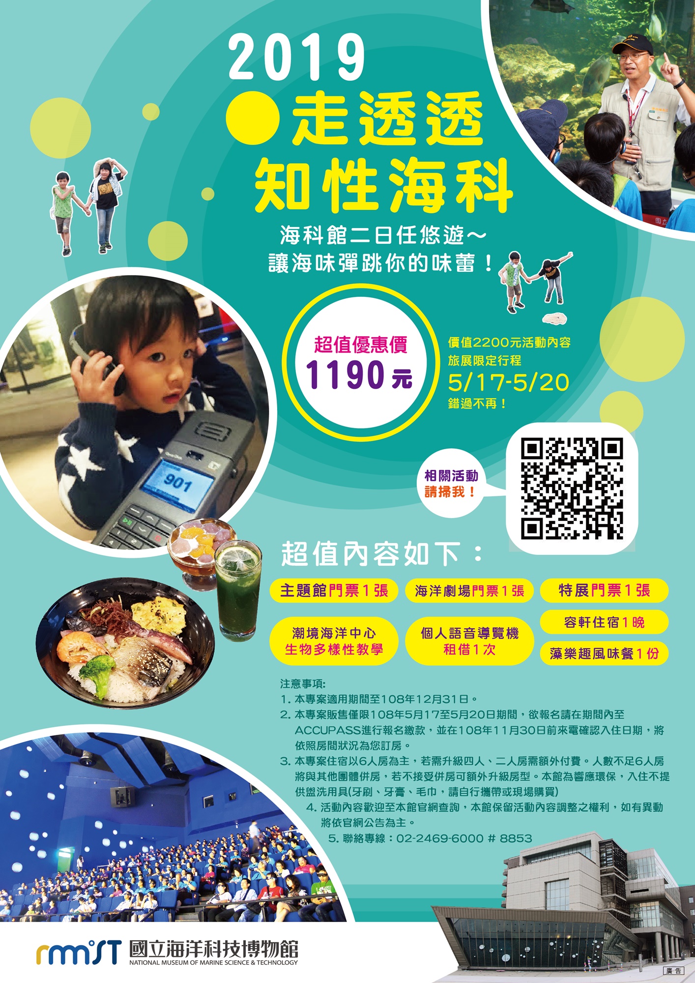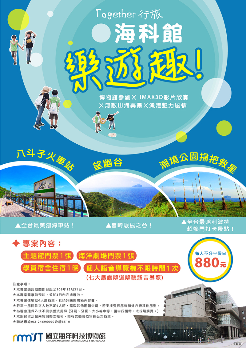 - 內容:主題館門票1張、特展門票1張、海洋劇場3D-I MAX電影門票1張、潮境海洋中心-生物多樣性導覽、容軒住宿一晚、藻樂趣風味餐一份、個人語音導覽機租借一次