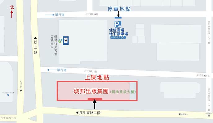 捷運行天宮站2號出口旁,國泰世華與城邦媒體大樓,一樓為城邦書房與國泰世華銀行。