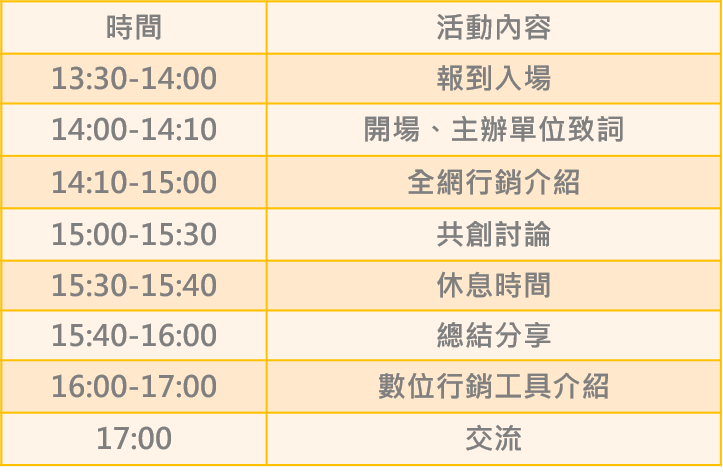 - 課程主辦單位保有修改、暫停或終止本活動之權利。如活動異動以本活動頁公告為主,如有重要異動將於活動前以簡訊/Email等方式通知報名者,請隨時注意本活動頁公告之事項與簡訊。