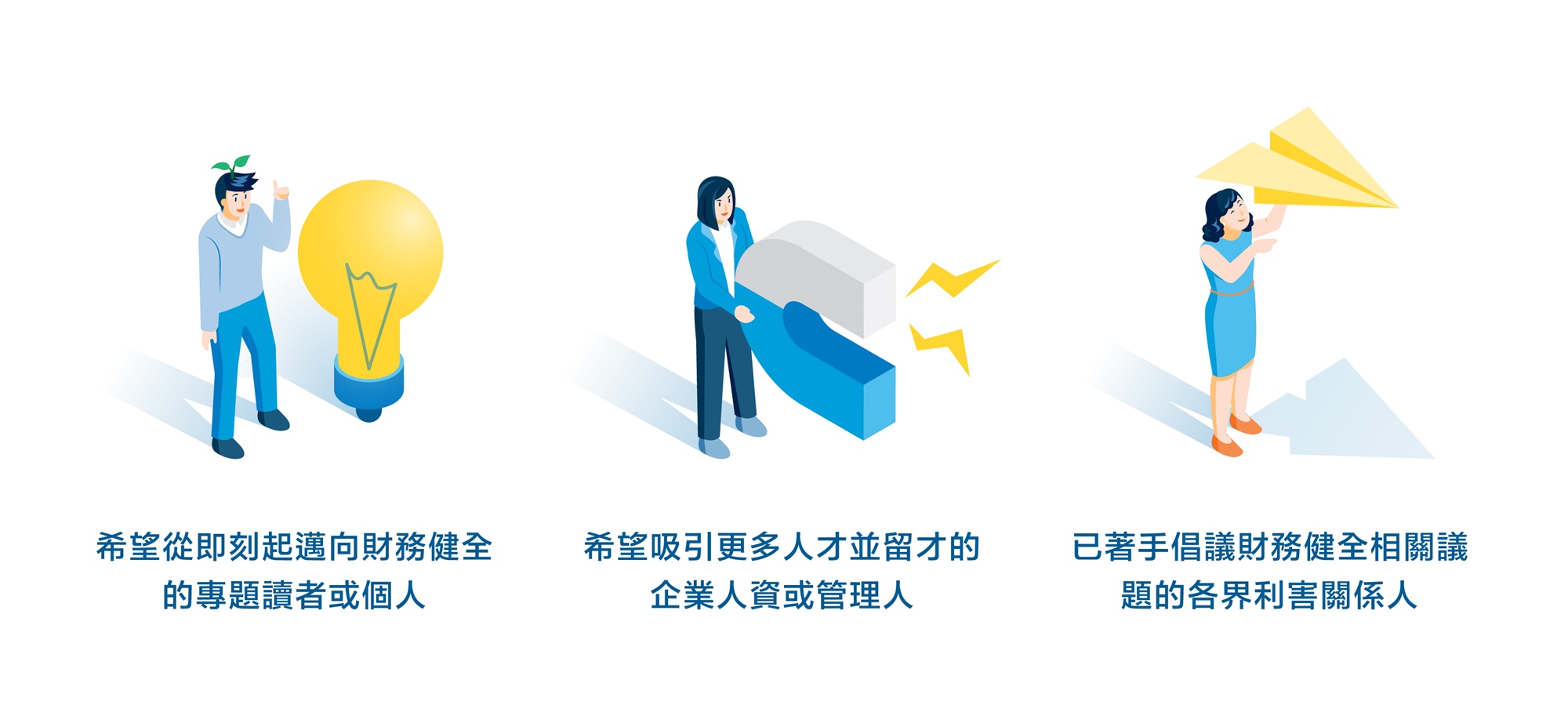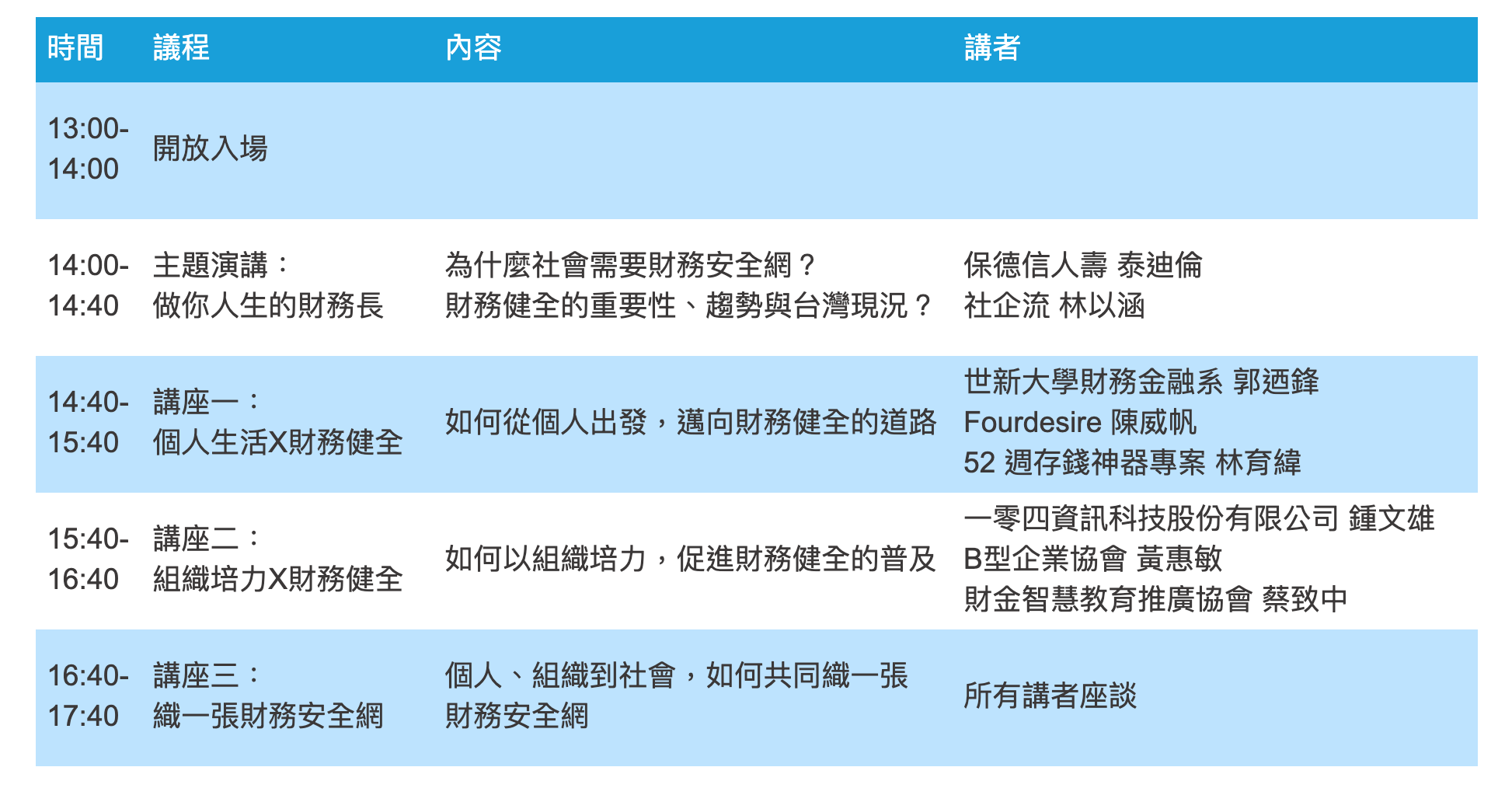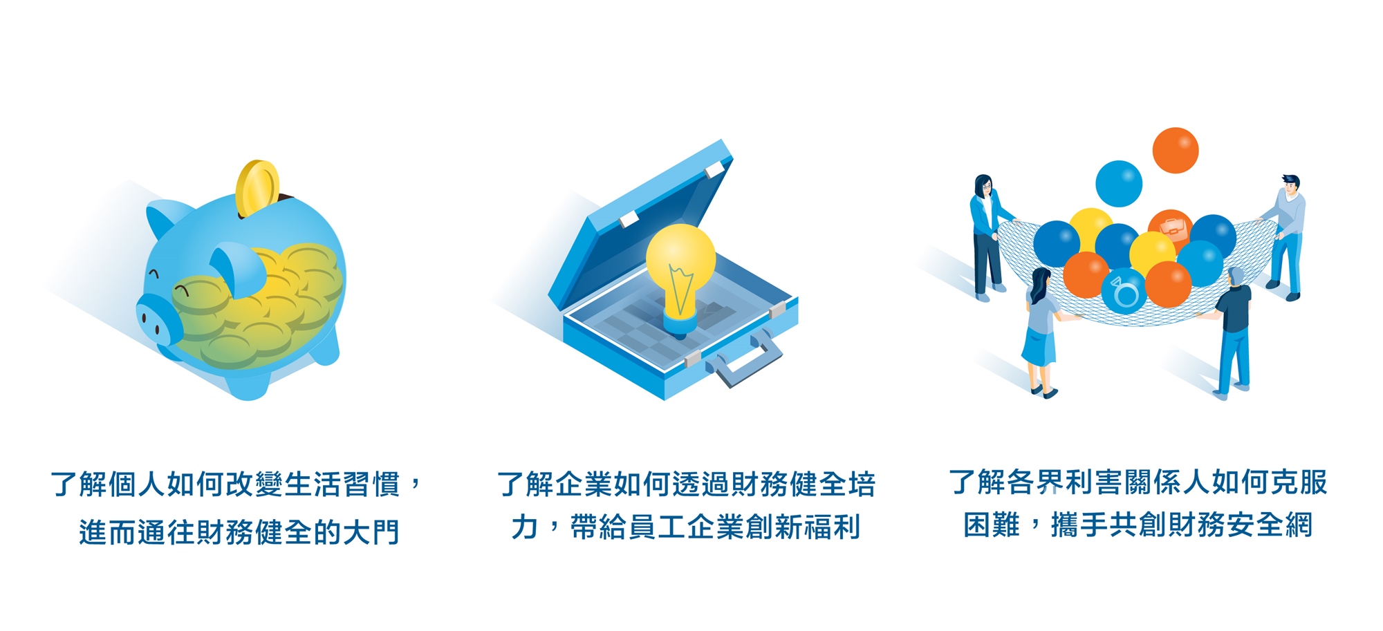 繼數位專題帶大眾完整了解議題脈絡後,趨勢論壇將以「財務健全點線面,共創財務安全網」為題,進一步探討如何從個人、組織、社會面出發,共同踏上通往財務健全的道路,並邀請來自不同領域的代表開啟跨域對話,啟發更多利害關係人參與倡議,共同為台灣社會編織一張財務安全網。