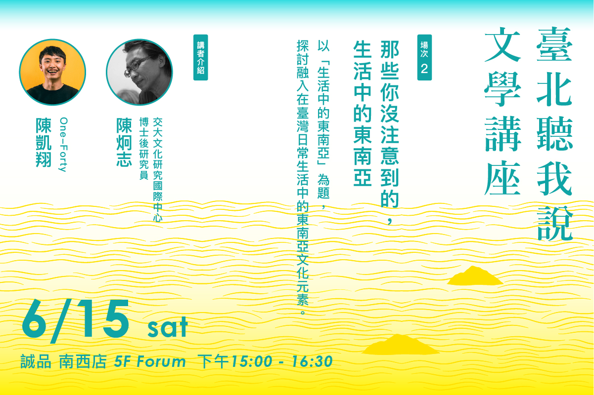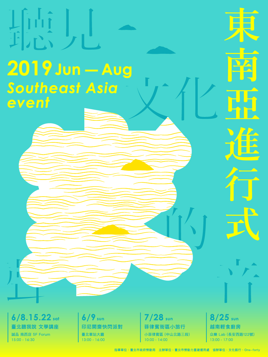 今年六月到八月,由臺北市勞動力重建運用處所指導的系列活動《東南亞進行式》,共有三場文學講座,與三場多元文化體驗活動,期望能以文學與生活體驗,帶民眾認識東南亞。