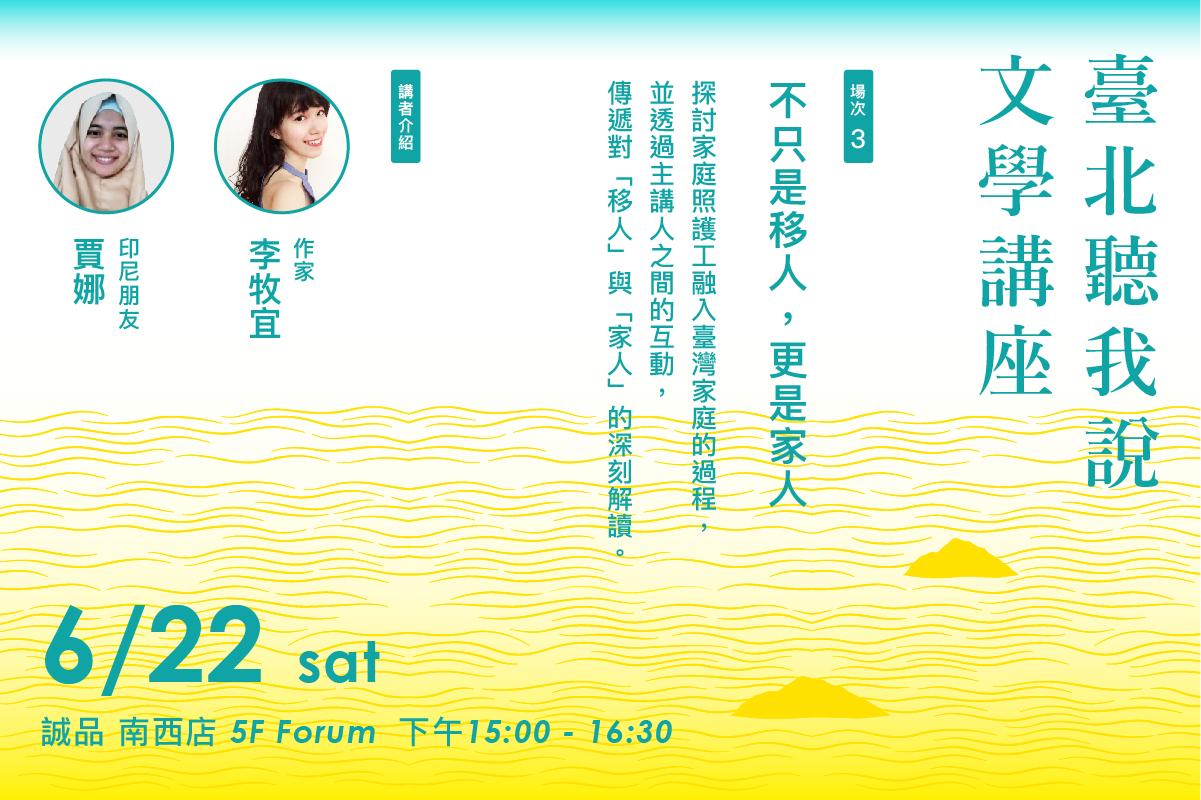 以「不只是移人,更是家人」為題,探討家庭照護工融入臺灣家庭的過程。此講座邀請《臺北 聽我說》詩集引言人兼知名作家李牧宜,為聽眾導讀30篇詩文精選,由她細膩獨到的觀察,分享詩集內的千絲萬緒,並請賈娜以原文朗讀分享她最愛的作品。透過她們的分享及互動,傳遞對「移人」與「家人」的深刻解讀。