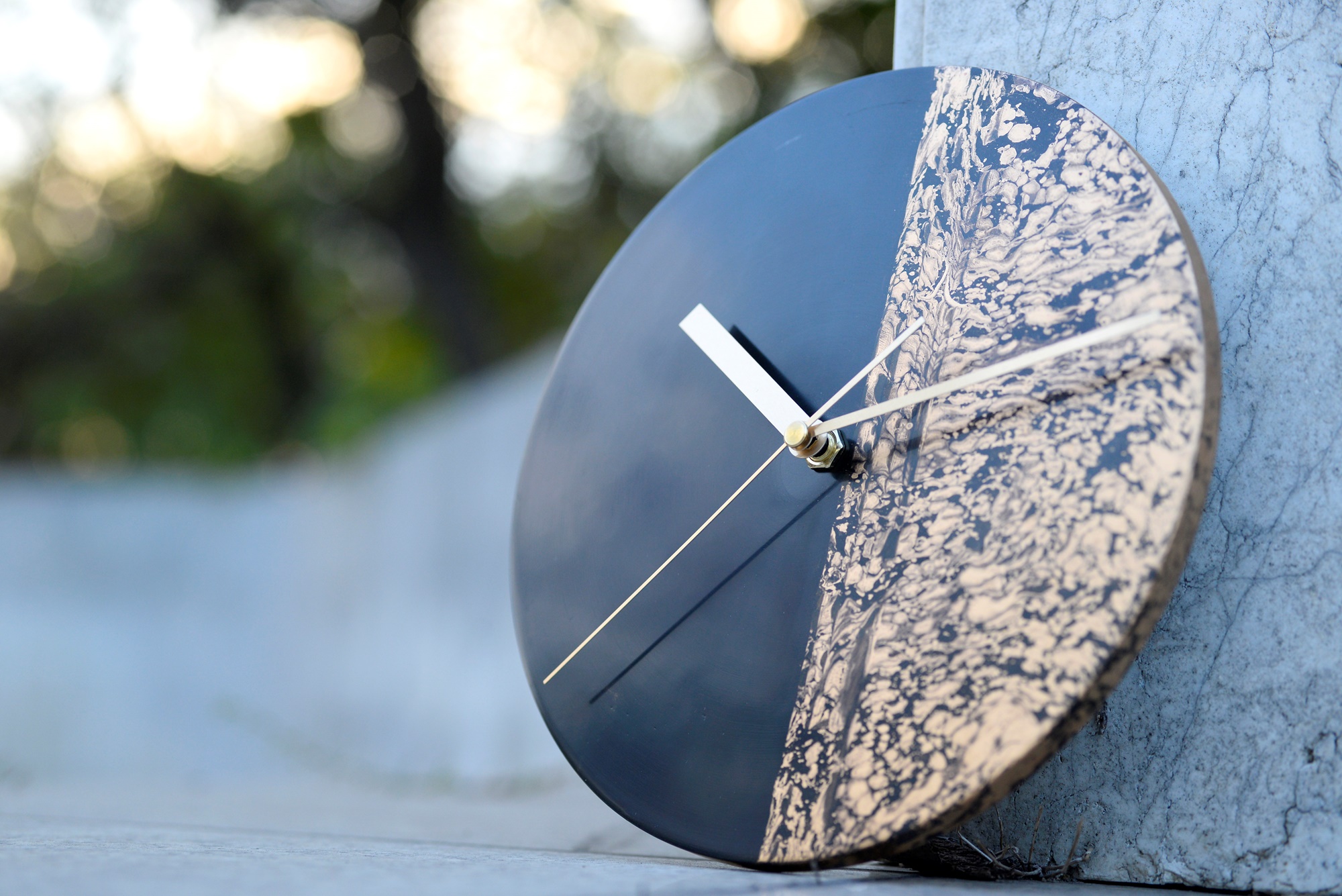這次課程使用漆器的蜻蛉塗技法延伸出的創作方式,是以水跟漆不同比重的特性,產生隨機的流動紋路,附著在平整光滑的鐘板後,再以金屬粉末加飾,製作出金色的波紋圖樣,即使是初學者也能輕易上手。
