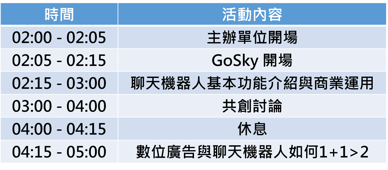 本次工作坊,邀請到現任全球最大聊天機器人平台 - Chatfuel 的大中華區合作夥伴 GoSky 的兩位講者前來分享且透過工作坊的演練,帶你了解企業如何導入聊天機器人、如何透過聊天機器人來創造業績,改善行銷瓶頸,讓機器人為你將每則訊息轉成收入!
