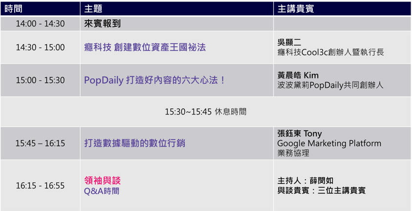 好廣告俱樂部首發會好評不斷,第二波分享會以「好廣告因內容而生」為起點,隆重邀請到資深媒體人-波波黛莉執行長黃晨皓、癮科技執行長吳顯二,以及Google Marketing Platform業務協理張鈺東Tony老師,三位業界最頂尖的講師,分享如何在各個資訊節點,打造用戶最喜愛的內容、同時掌握消費者數位軌跡,從內容策略、建立數位資產王國、驅動數位行銷,三大佈局讓你運籌帷幄!身為廣告圈子的你絕不能錯過!