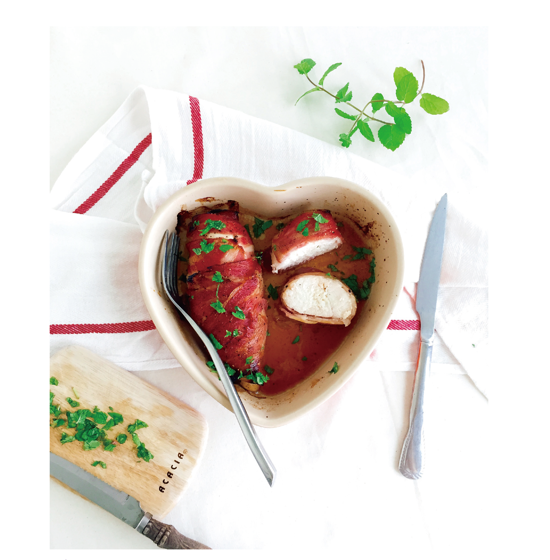 培根捲雞胸肉因為加了培根可增添雞胸肉在脂肪的攝取不足,雞胸肉不僅有舒肥過後的口感,搭上微焦的培根,在烘烤時就會聞到陣陣香氣,只要丟進烤箱就能完成的一道絕美料理,是連小朋友也很喜歡!