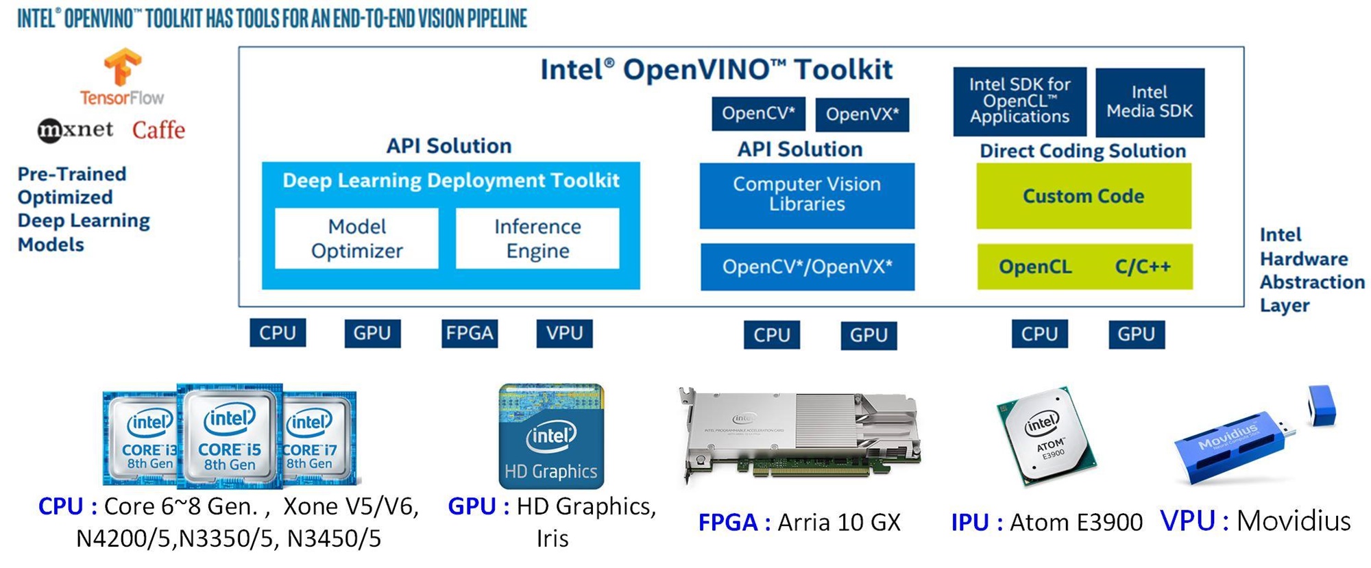 2018年Intel推出的開放電腦視覺推論及神經網路(深度學習)優化工具包-OpenVINO,其整合了OpenCV、 OpenVX、OpenCL等開源軟體工具,以及常見的Caffe、TensorFlow、Mxnet、ONNX等深度學習框架所訓練好的模型及參數,硬體方面則同時可支援自家CPU、 GPU、FPGA、VPU等硬體加速晶片。
