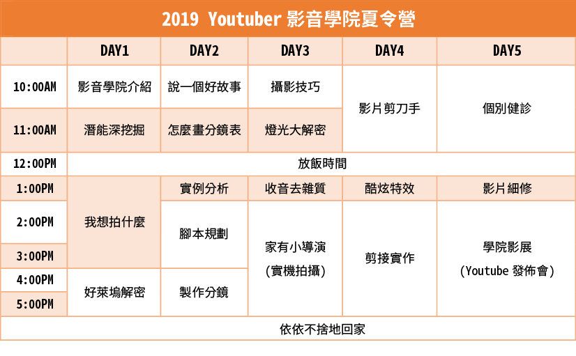 Youtuber影音學院,今夏最夯的影音夏令營! 想成為像小玉、聖結石、HowHow、這群人、蔡阿嘎、阿滴英文 一樣的百萬Youtuber嗎? 那你一定要來Youtuber影音學院! 從潛能探索的本質出發,在人人都想成為 Youtuber 的時代,重新解構Youtuber的成功要素「人」,放大個人特質與庶民化的影像語感,才是新世代影像的關鍵! 老師帶領學員探索自我特質,體驗Youtuber從企劃構想、分鏡腳本、器材選購、拍攝打光、收音乃至剪輯特效的完整流程。