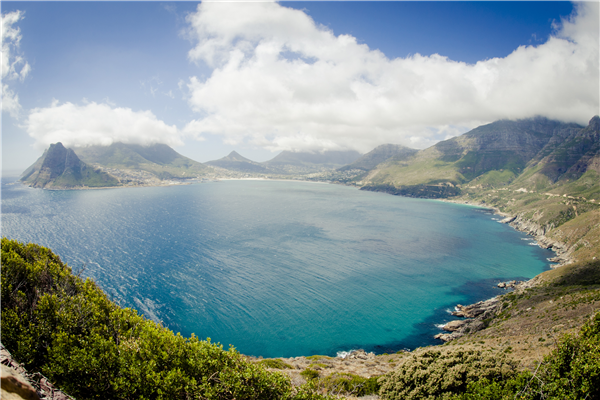 南非的開普半島,背後是就是著名的桌山(Table Mt.),高約1000公尺。著名的好望角就位於半島的角點。