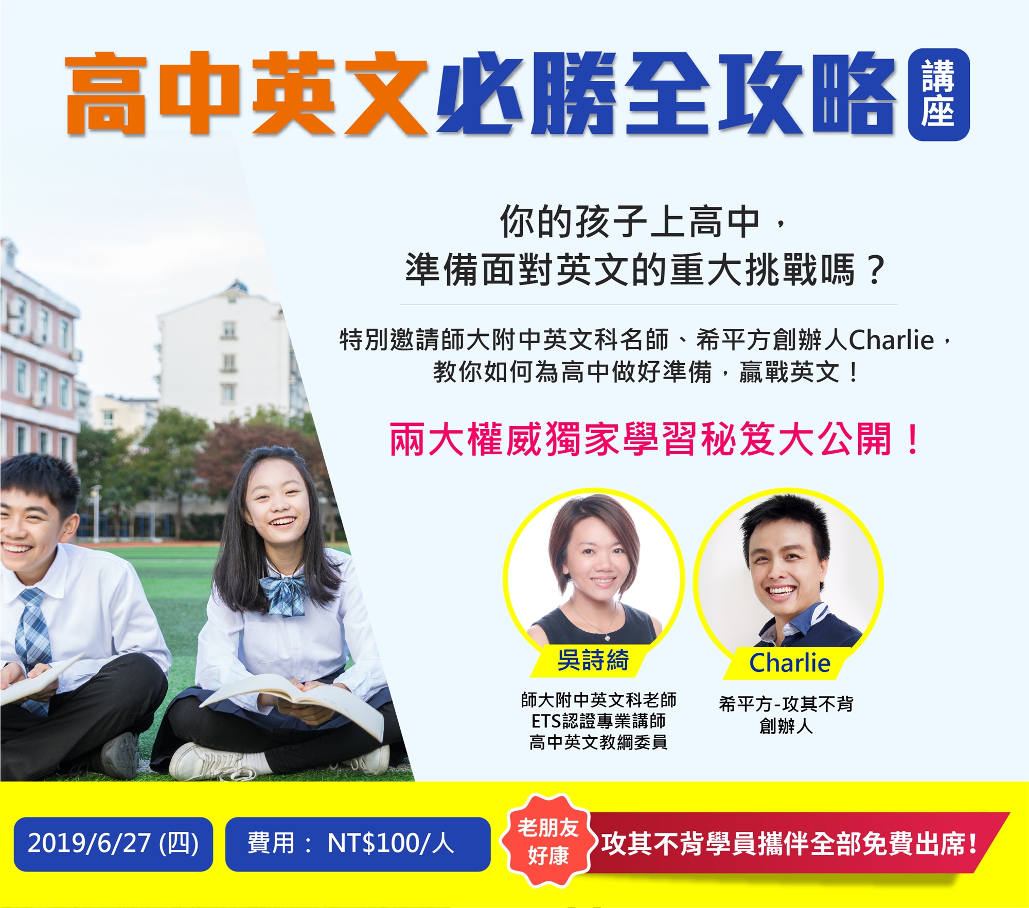 2019年的這個暑假,Charlie將親自傳授「計畫式學習」法的秘笈,並與師大附中英文科吳詩綺老師聯手一起帶領所有高中生與家長們贏戰108年新課綱及高中新挑戰!