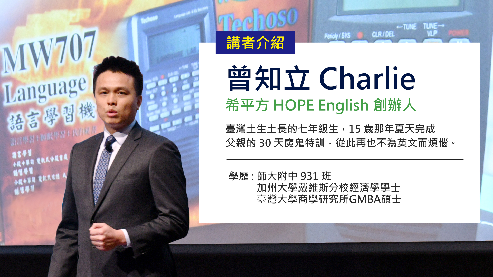 1998 年的夏天,Charlie和弟弟分別 15、16 歲,當時正值國中升高中及高一升高二的暑假,許多人都利用假期出去玩,但父親用自己發明這台語言學習機,搭配自己發明的「計畫式學習」法,帶著他們進行了一次「英文魔鬼訓練營」。就在這樣的計畫安排下,原本大量閱讀可能需要一年時間才能累積的字彙、片語、句型等程度,他們兩在 30 天內快速累積超過 3,000 個英文字彙,以至於高中開學翻開課本,竟然整本課本找不到一個不會的生字!雖然過程非常辛苦,但一個月的密集訓練換來的是一輩子受用的英文能力,父親把兩兄弟的英文教到聽、說、讀、寫精通的程度,從此改變他們的人生。