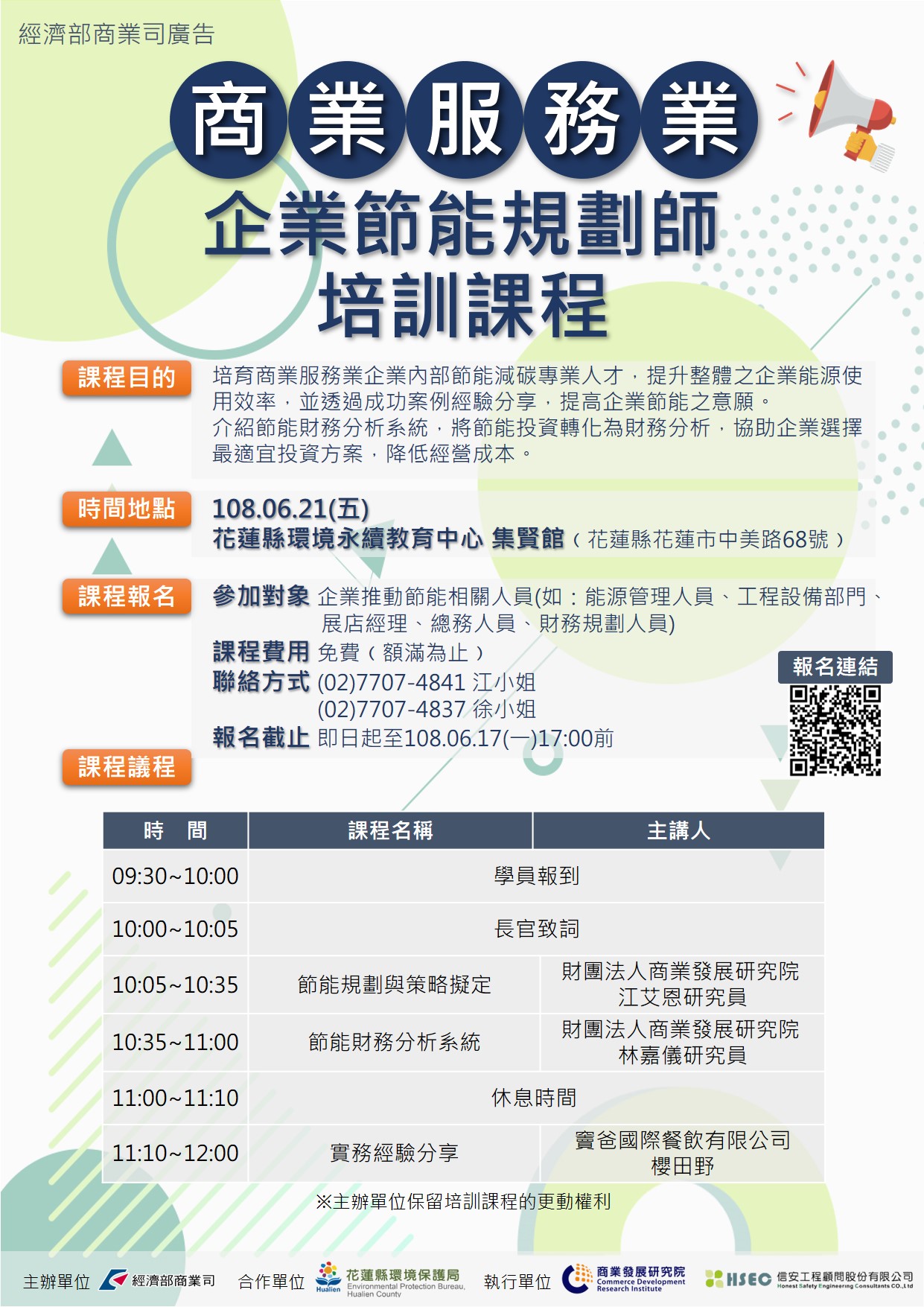 - 參加對象:企業推動節能減碳相關人員(如:能源管理人員、工程設備部門、展店經理、總務人員、財務規劃人員等)。
