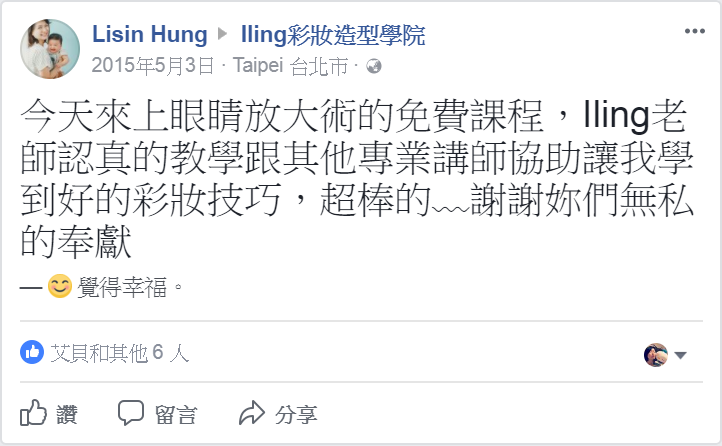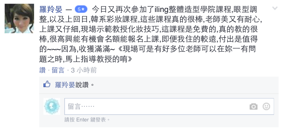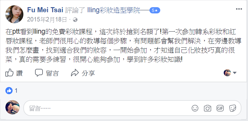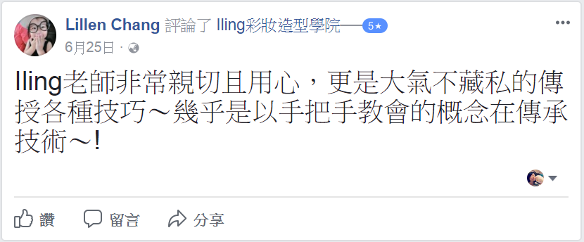 iling老師有15年以上的經驗。曾上過電視【康熙來了】、【小明星大跟班】、【公視誰來晚餐】等節目還有許多雜誌(Vogue、ELLE)。並且在各大比賽中擔任評審、獲得植村秀創藝彩妝大賞金賞獎,以及金曲獎、電影節等時尚後台彩妝經驗。