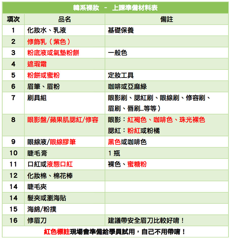 📣 上課準備材料表 (請女孩攜帶『黑色部分』工具喔!)