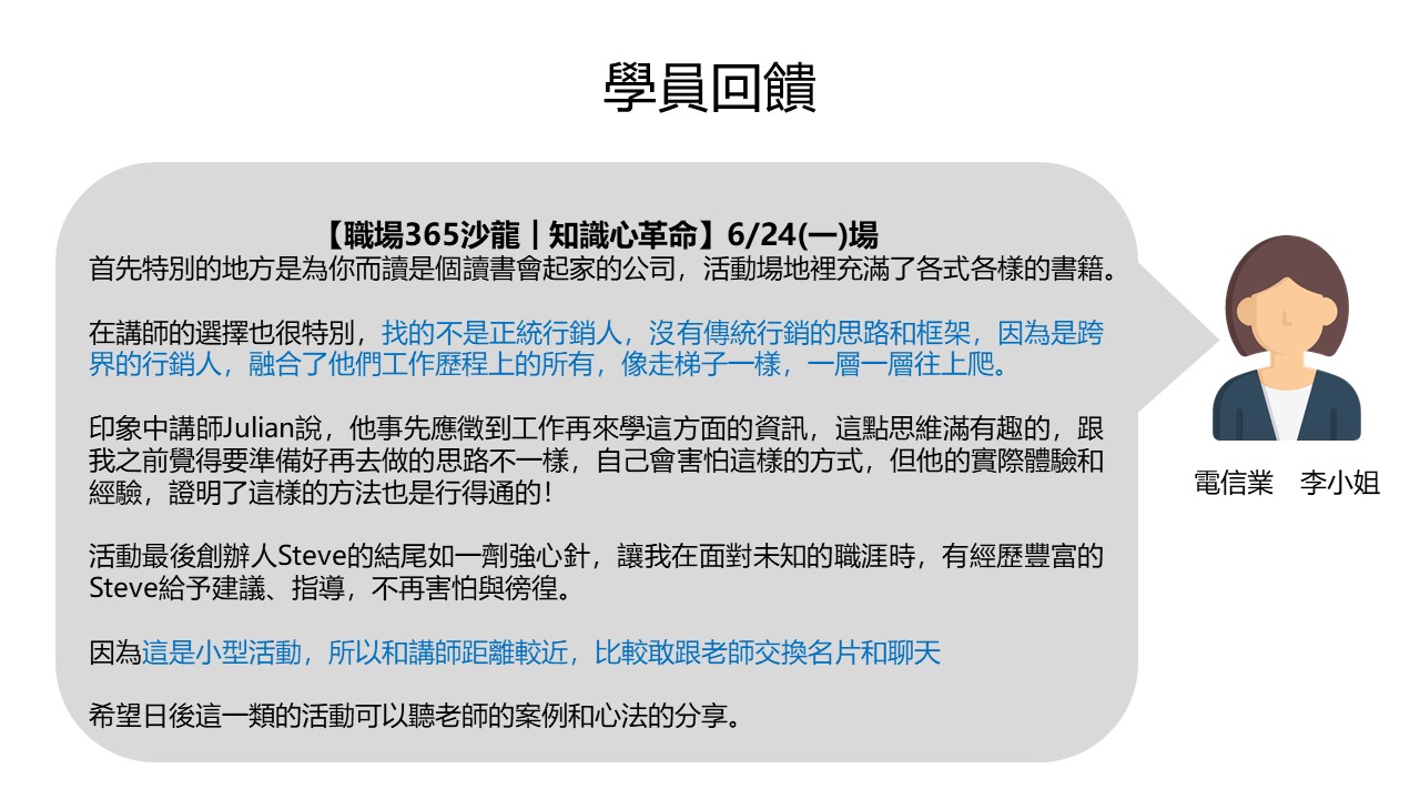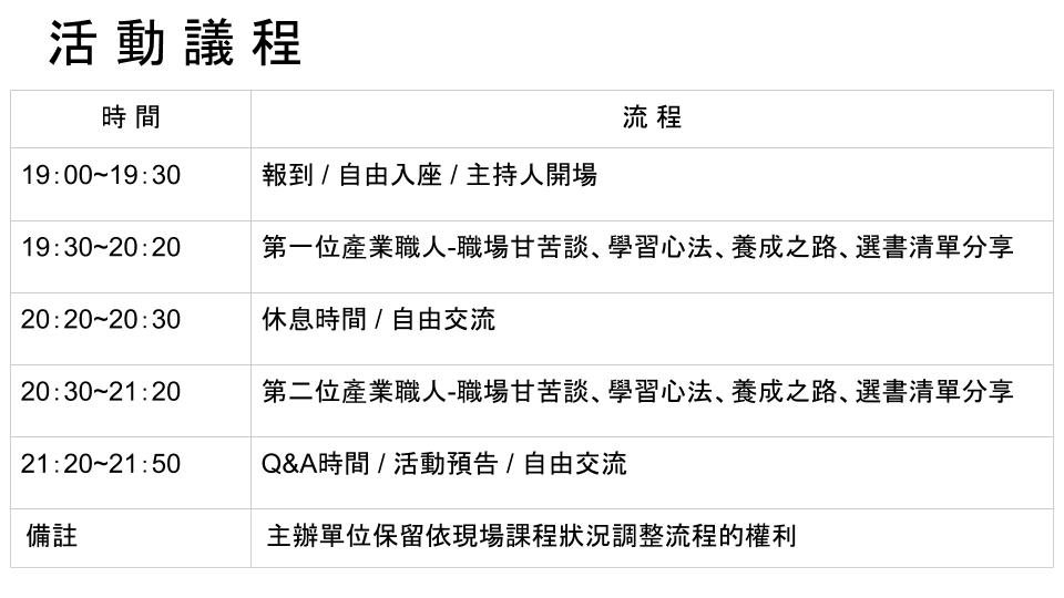【為你而讀】秉持著傳播知識、傳播閱讀的宗旨,透過人與人的線下交流串聯起有溫度的學習社群。2019年,我們推出全新的【職場365沙龍】,每場活動將邀請兩位跨界的產業職人,暢聊自身產業的職場甘苦談,包括從入門、進階到大師的養成之路,與業界各種眉角、軼事、趣聞的分享,並請嘉賓傳授職人學習心法、推薦職人選書清單。