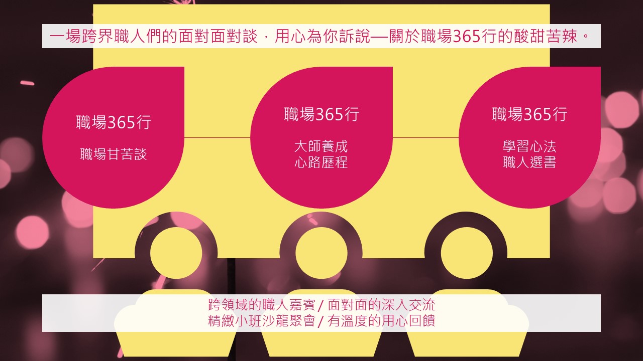 透過【職場365沙龍】,我們將與職人面對面對談,讓職人們用心為你訴說關於職場365行的酸甜苦辣,最後讓觀眾和嘉賓進行深刻的問答、討論。知識心革命,職場起義,從心出發。