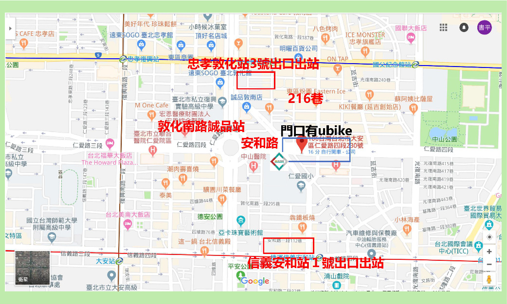 2. 信義安和站1號出口→沿安和路一段向北直行→右轉仁愛路四段266巷