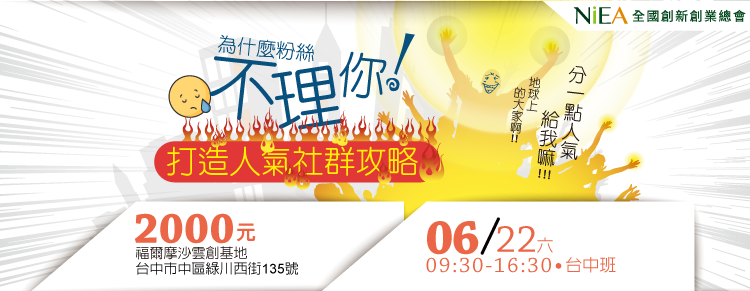 - 地點:福爾摩沙雲創基地(台中市中區綠川西街135號13樓,東協廣場7號電梯直達13樓)
