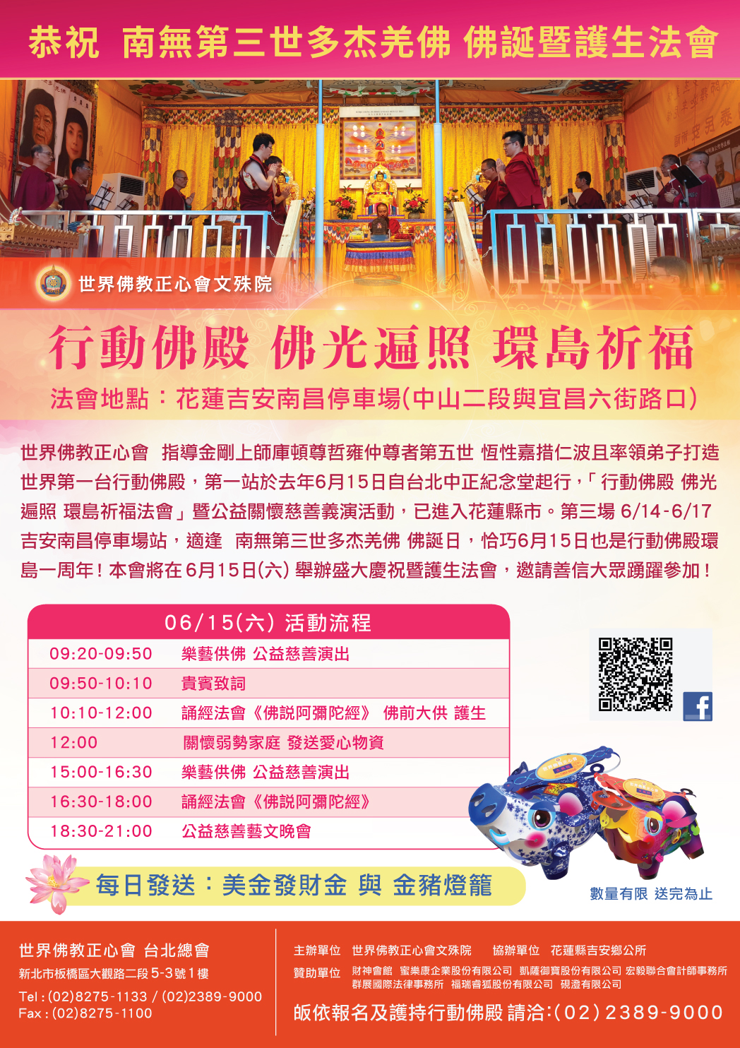 第三場6/14-6/17吉安南昌停車場站,適逢 南無第三世多杰羌佛佛誕日,恰巧6月15日也是行動佛殿環島一周年!本會將在6月15日(六)舉辦盛大慶祝暨護生法會,邀請善信大眾踴躍參加!!