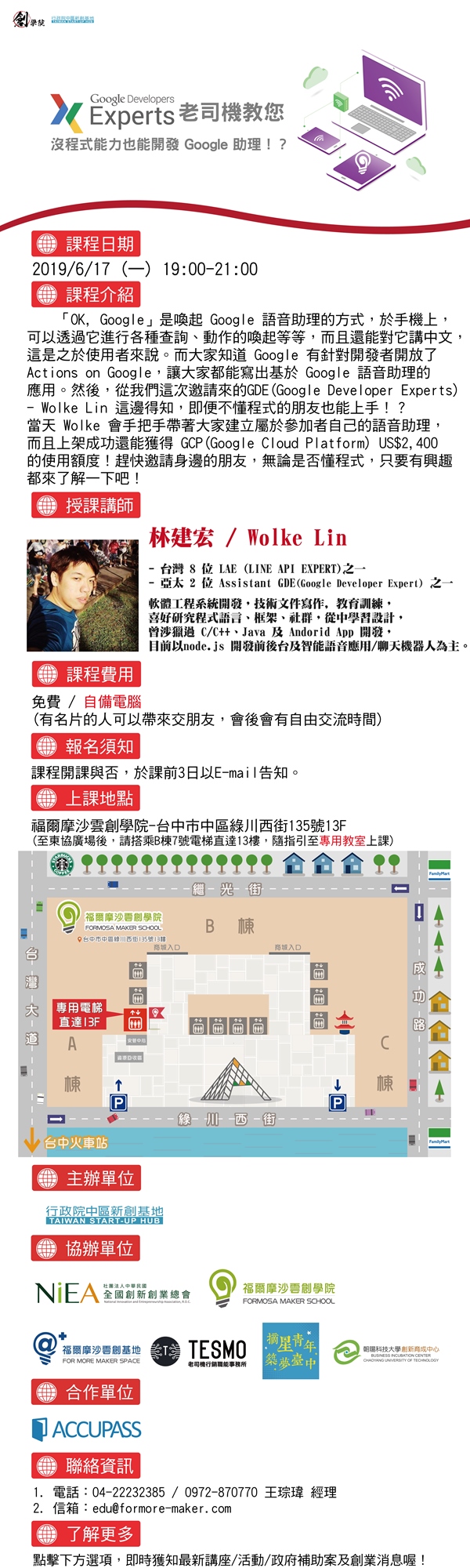 台中 福爾摩沙雲創學院 本次邀請到 GDE (Google Developer Experts) - Wolke Lin 來授課 - 「OK, Google」是喚起 Google 語音助理的方式,於手機上,可以透過它進行各種查詢、動作的喚起等等,而且還能對它講中文,這是之於使用者來說。而大家知道 Google 有針對開發者開放了 Actions on Google,讓大家都能寫出基於 Google 語音助理的應用。