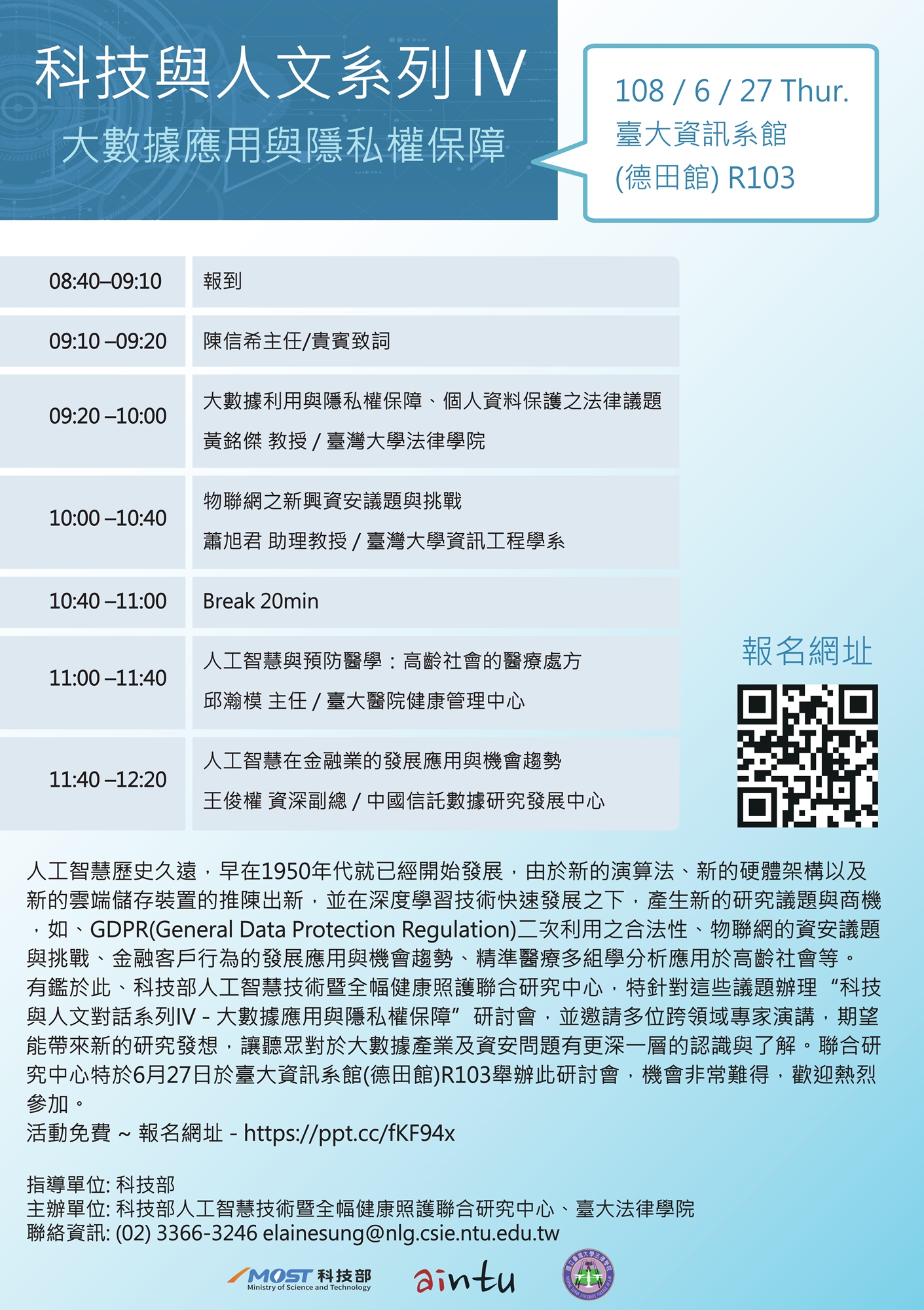 有鑑於此、科技部人工智慧技術暨全幅健康照護聯合研究中心,特針對這些議題辦理"人文與科技對話系列 IV – 大數據應用與隱私權保障"