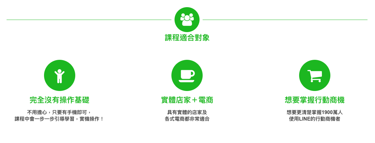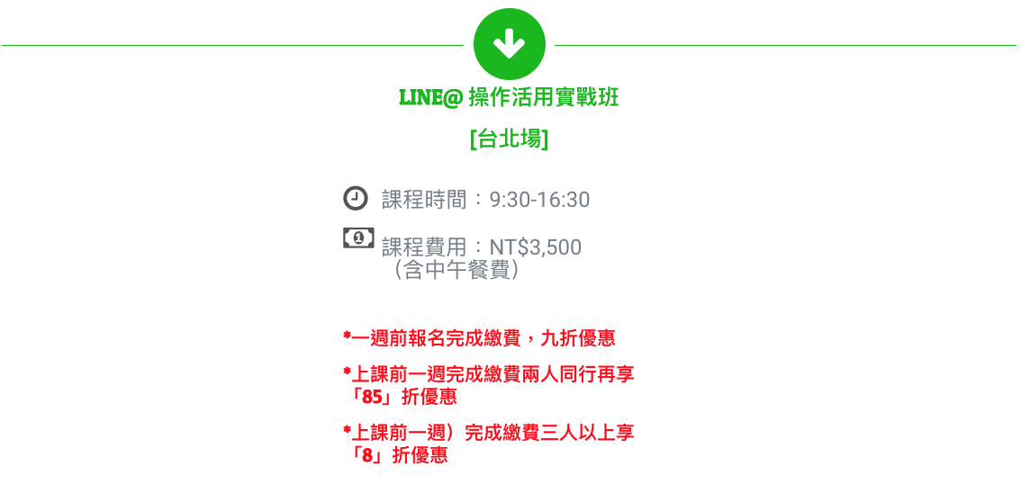 LINE@ 生活圈 | 操作活用實戰班:集結天長互動創意過往輔導超過1,000家LINE@生活圈店家實務經驗,從頭開始讓你一步一步了解LINE@所有功能與操作,讓你對LINE@有清楚的了解,才能針對您的行業類別,規劃出LINE@ 生活圈行銷策略擬定方針與執行方向。