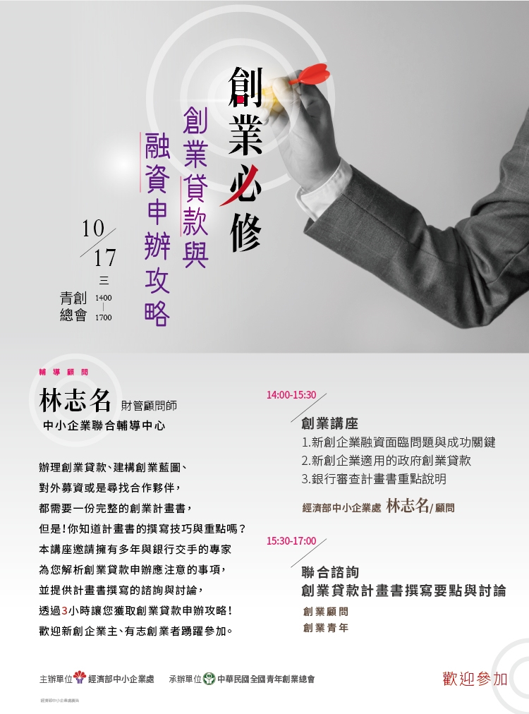 10/17(三)貸款創業與融資申辦攻略 報名頁面https://ppt.cc/fcbFFx
