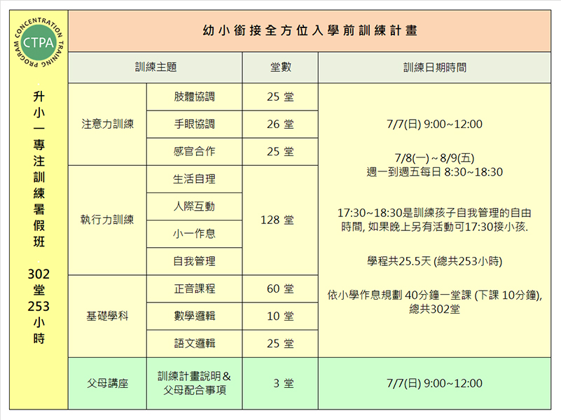 訓練規畫內容完整 ==> 注意力訓練+執行力訓練+基礎學識訓練+小學日常作息生活自我管理訓練