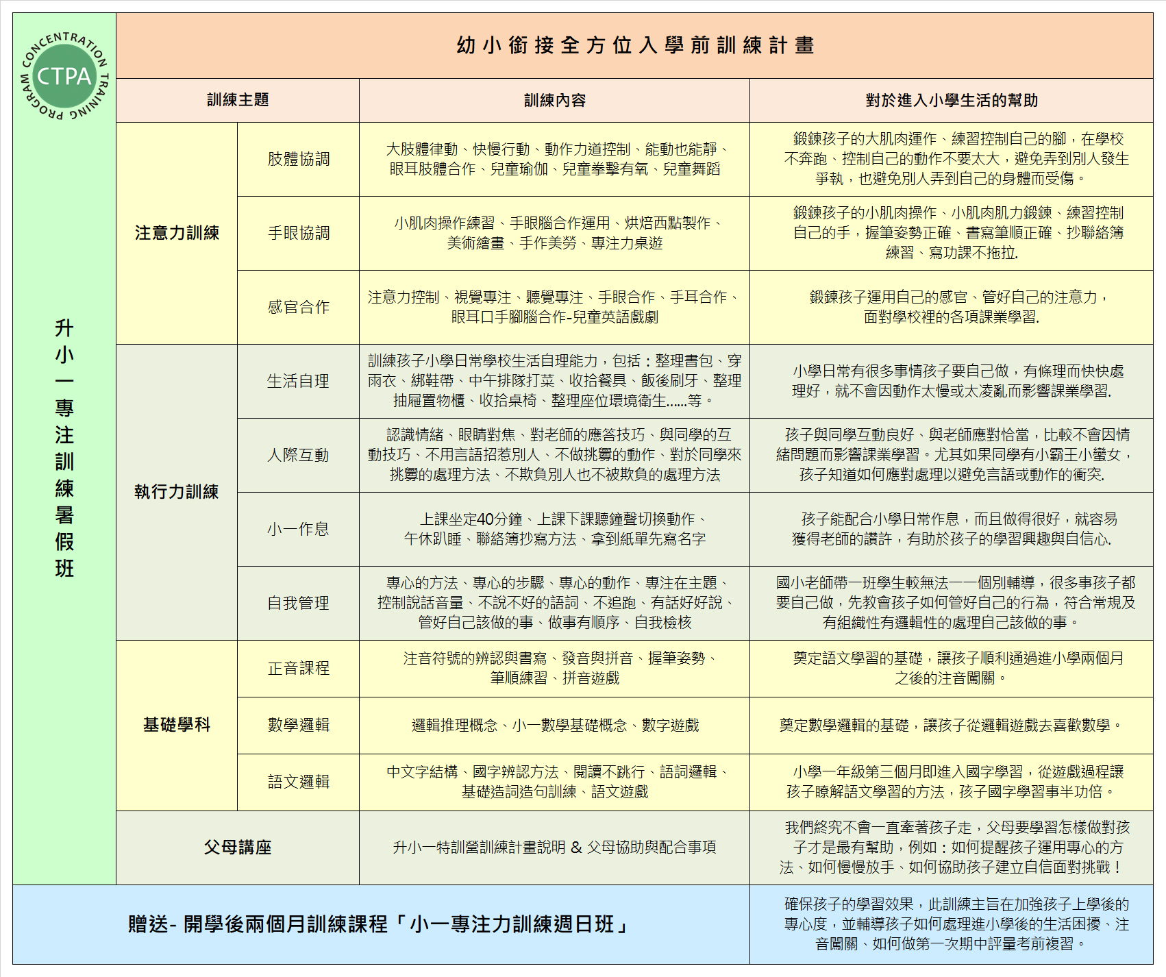 *為確保孩子的學習效果,可自由選擇是否參加贈送訓練課程「小一專注力訓練週日班」,9月~10月每週日一堂兩小時,此訓練主旨在加強孩子上學後的專心度,並輔導孩子如何處理進小學後的生活困擾、注音闖關、第一次期中評量考前複習。
