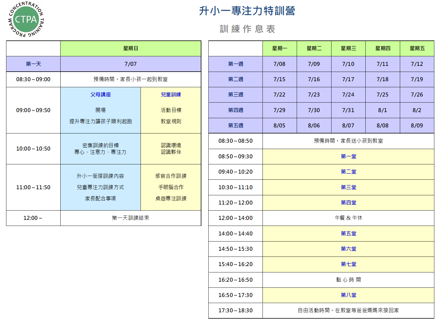 *訓練日期:7/7(日)~8/9(五),第一天7/7(日) 9:00~12:00分兩個教室雙軌同時進行小孩課&大人課,第2天7/8起(8:30~18:30)只有小孩受訓。