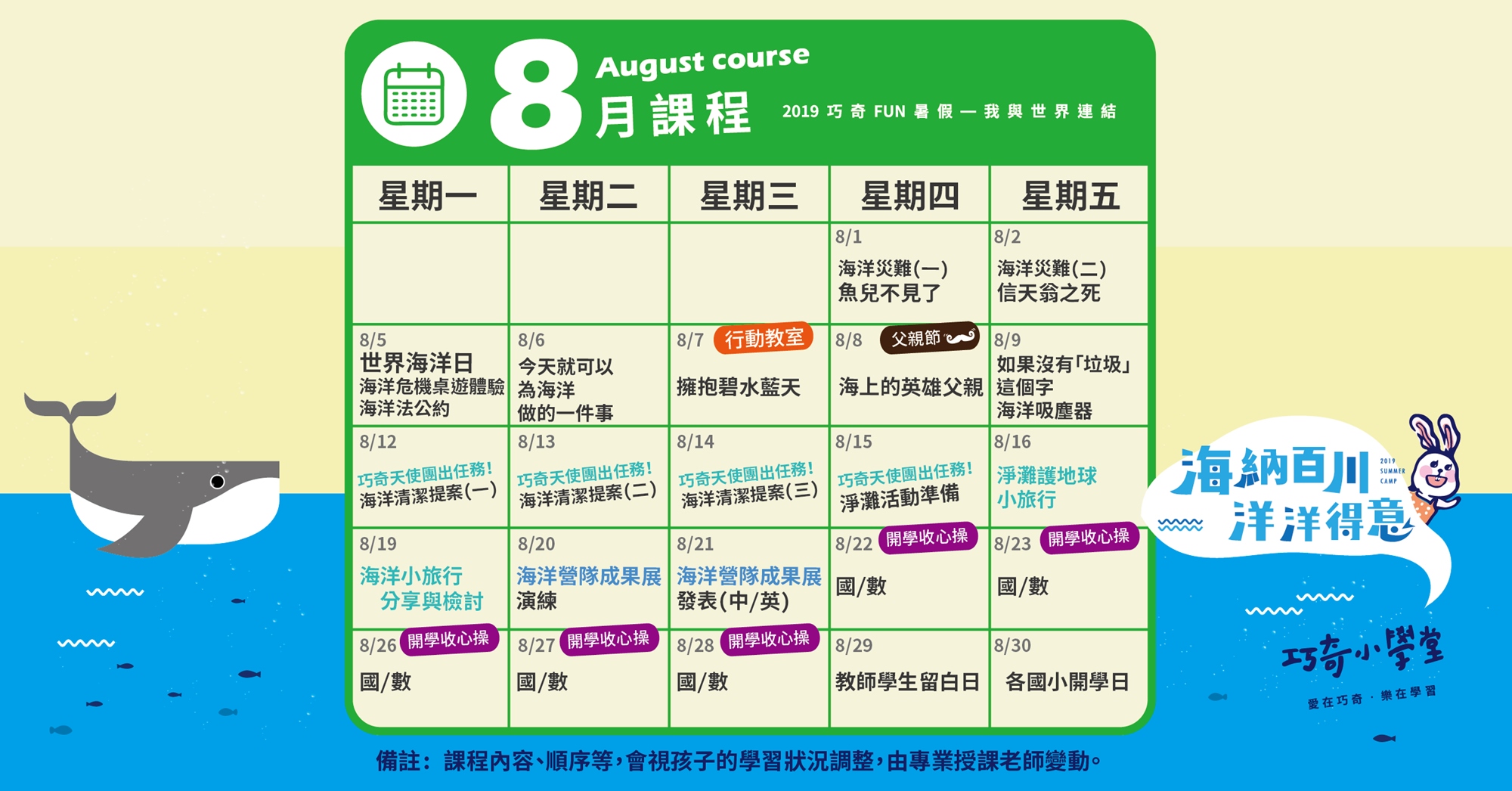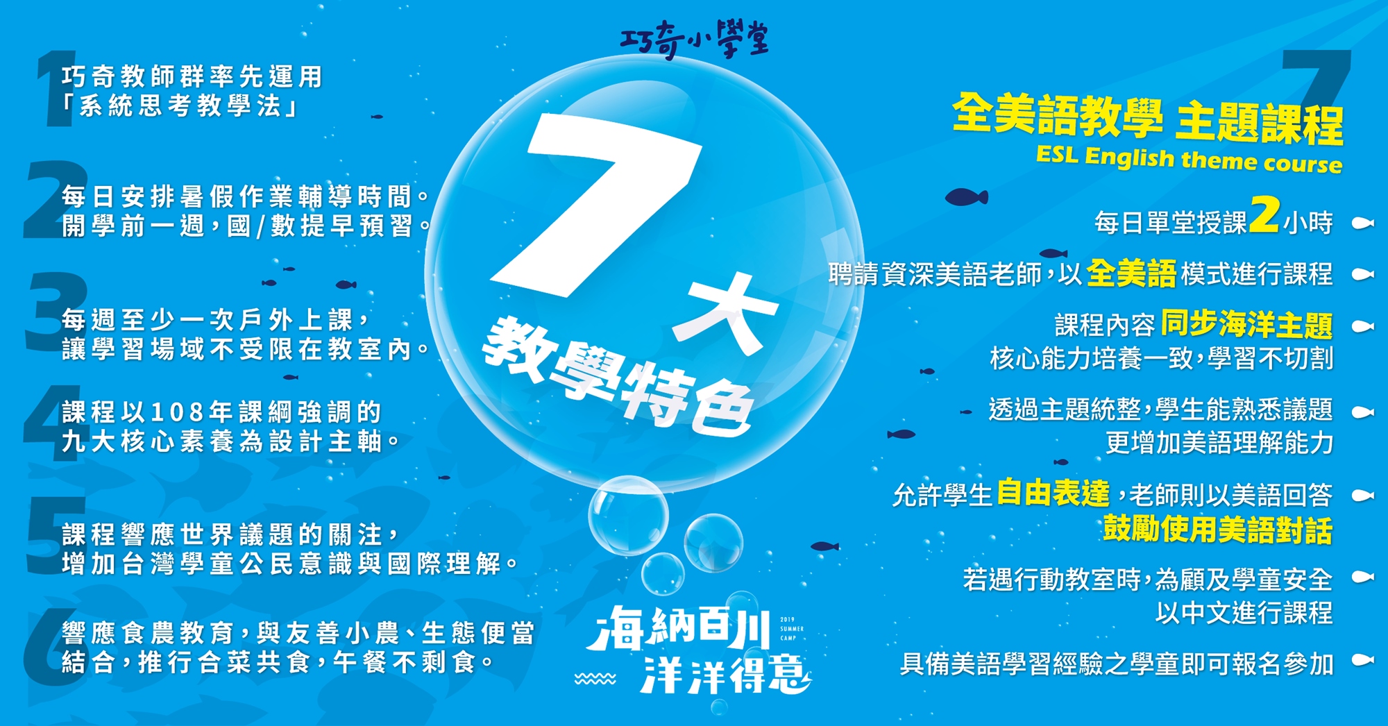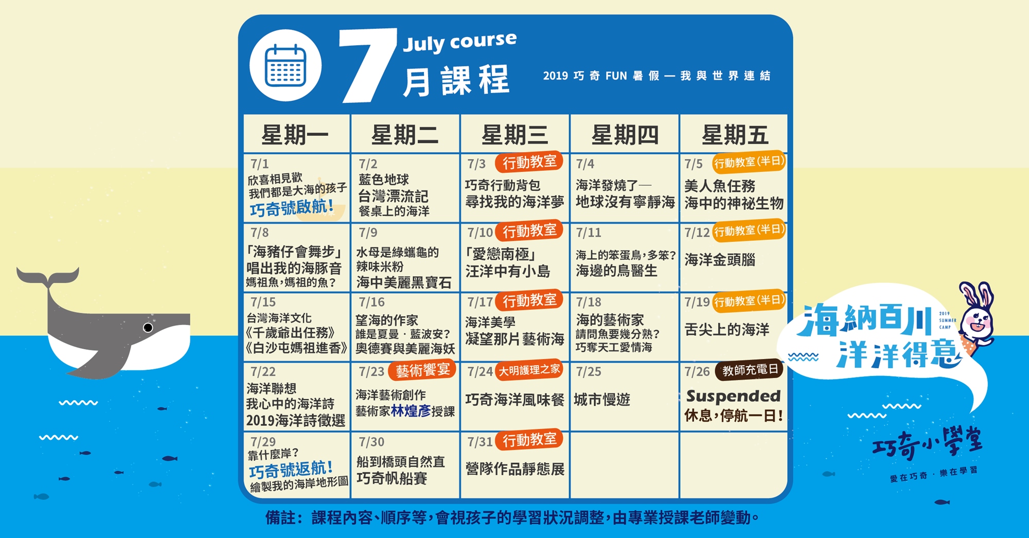 海洋和大地一樣都是我們的母親,我們如何透過課程設計,在源源不絕的海洋資源裡,看見他為我們的付出,而人類的貪婪與健忘,帶給他無情的傷害,我們想帶孩子們回來一起討論與學習。2019年的暑假,巧奇號將啟航囉,孩子們跟我們一起來一趟海洋之旅吧!