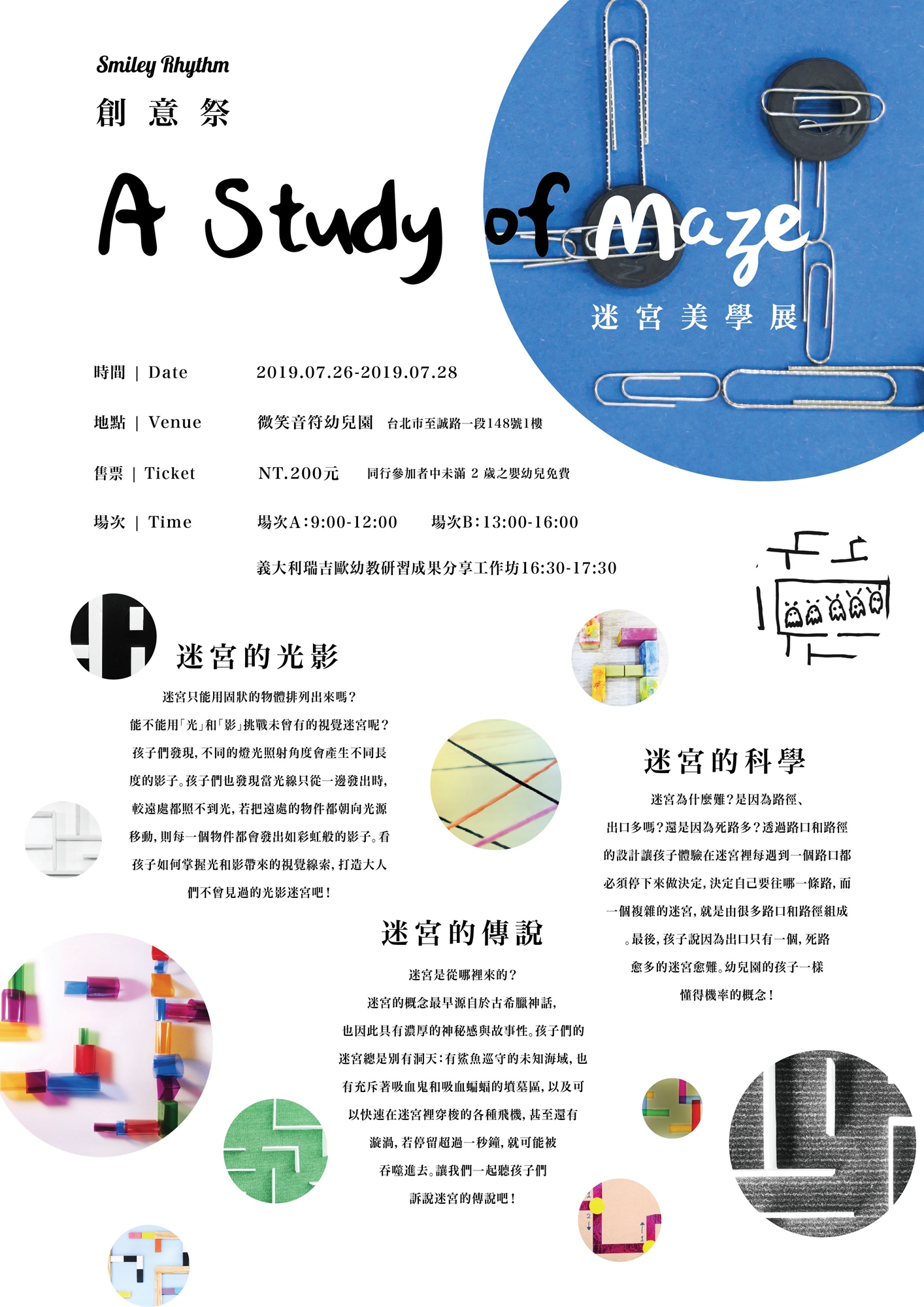 今年的 【Smiley Rhythm 創意祭】主題是「A Study of Maze | 迷宮美學展」,以迷宮的傳說、科學以及光影三個面向研究迷宮各種有趣的特性。展覽中除了大型迷宮的展示之外,也邀請參加者發揮想像力及創造力,融入自己的創意點子,產生更多的可能性。展覽設有「義大利瑞吉歐幼教研習成果分享暨工作坊」,透過演講及工作坊,期望能夠引發更多關於教育的思考與對話。