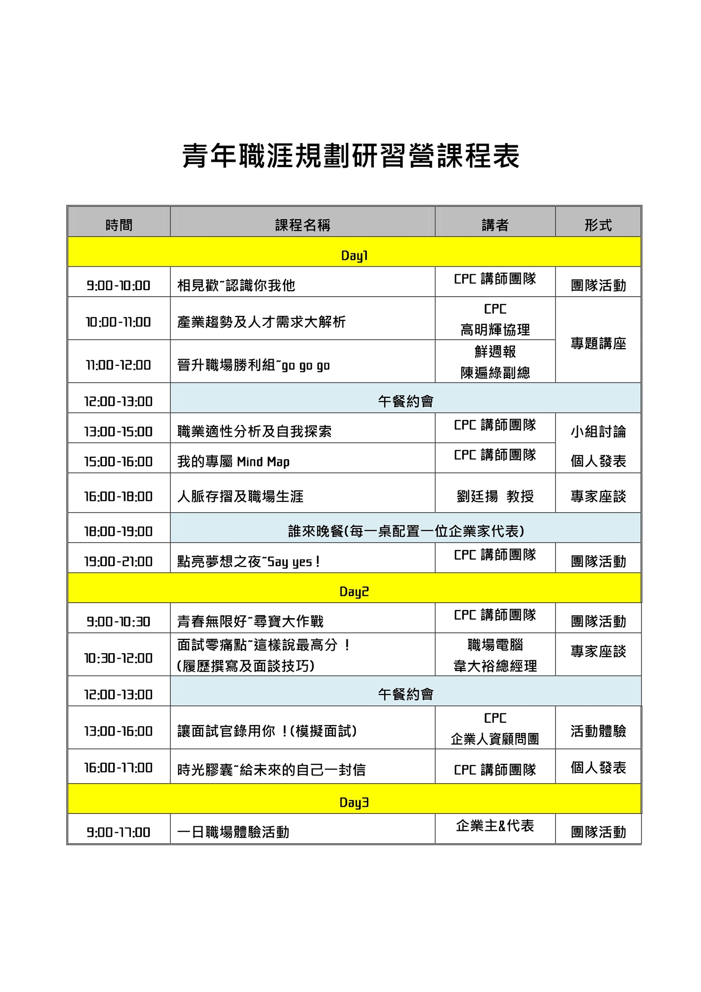 - 課程內容:提供青年自我評估、職涯規劃、職場一日體驗等就業諮詢。