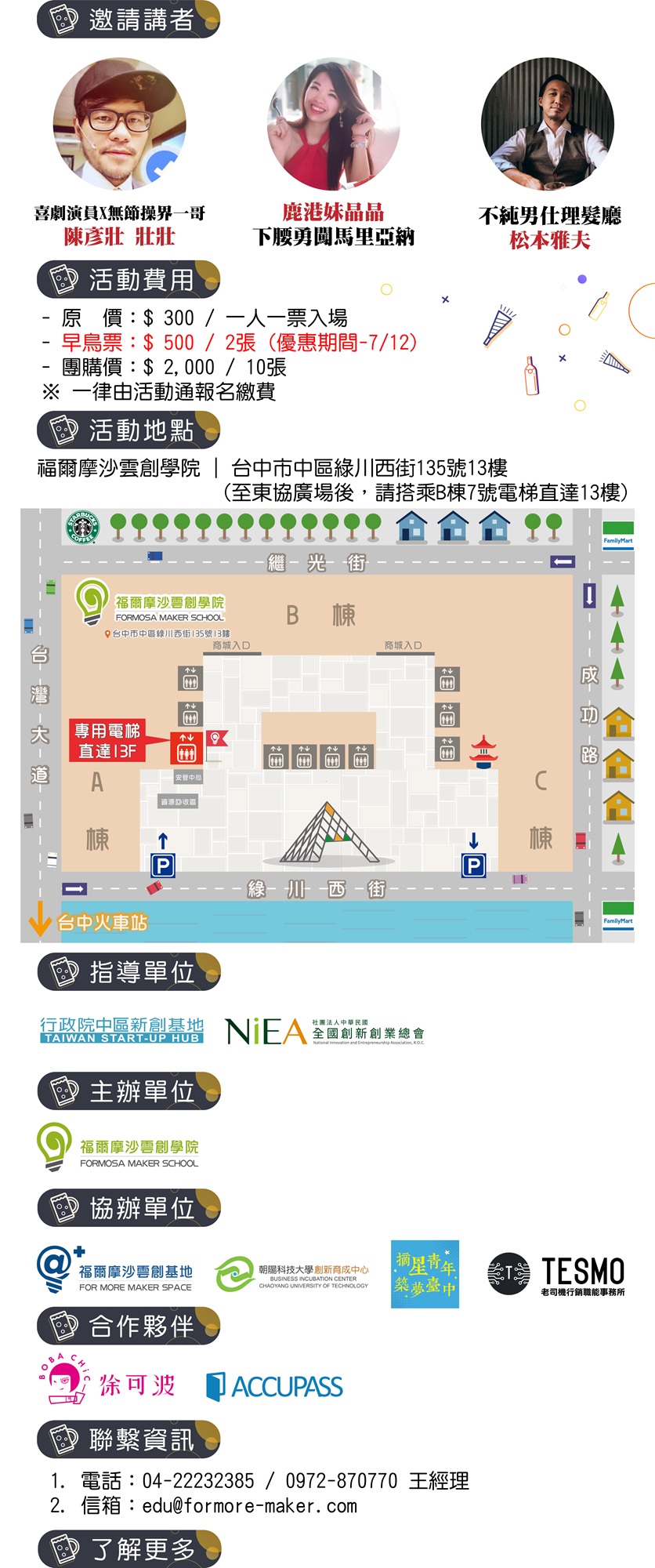 福爾摩沙雲創學院-至東協廣場後,請搭乘B棟7號電梯直達13樓