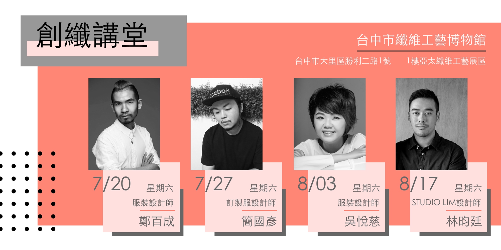 這次展覽將於108年5月18日至11月3日假臺中市纖維工藝博物館1樓展廳展出,從開展後陸續舉辦一系列共六場與此展覽、慢時尚相關講題的創纖講堂。七月及八月分別各有兩場活動,邀請到幾位知名設計師來演說:鄭百成、簡國彥、吳悅慈、林昀廷,歡迎大家來共襄盛舉,對工藝、慢時尚有更深入的理解與想像。