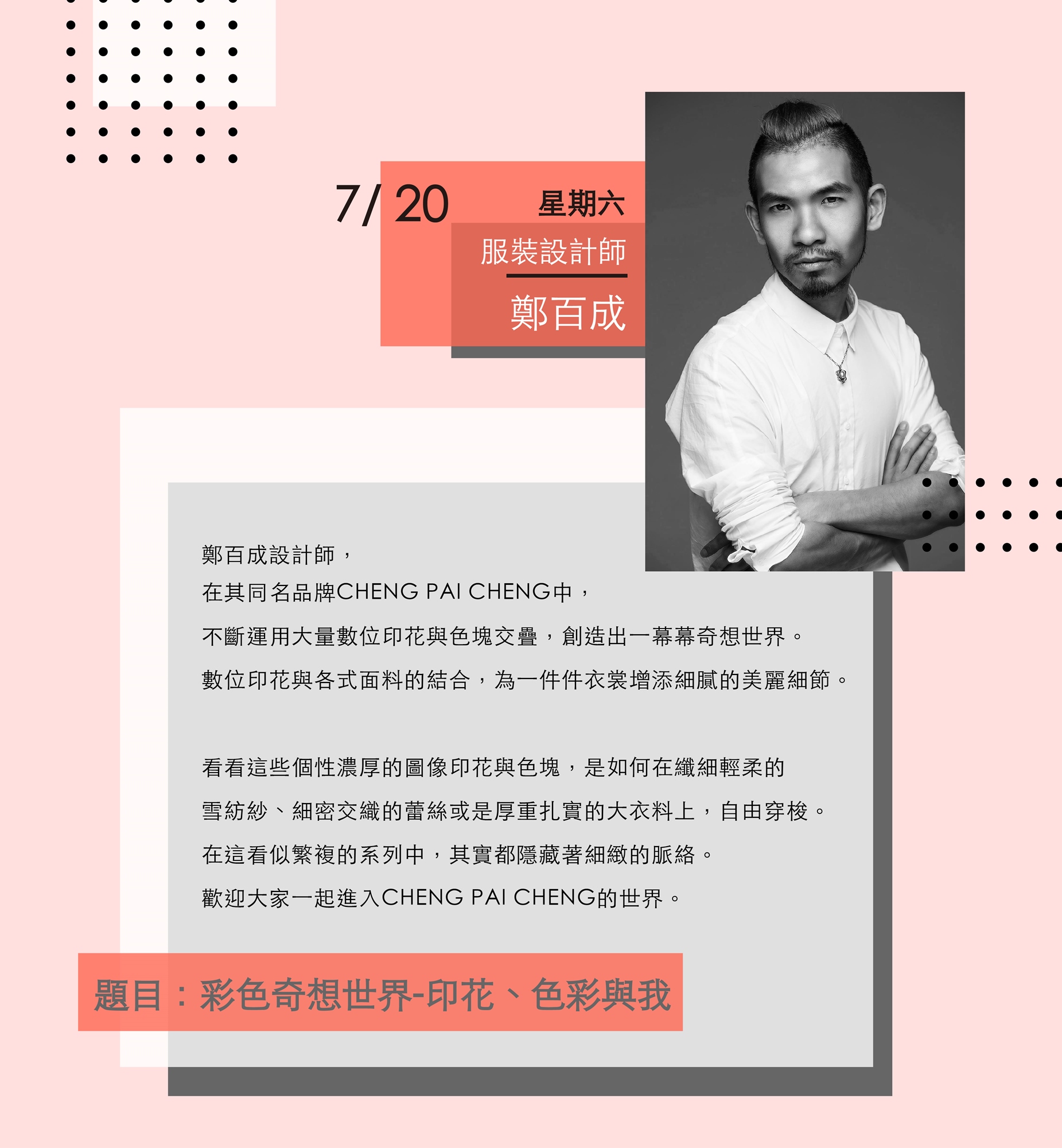 鄭百成設計師,在其同名品牌CHENG PAI CHENG中,不斷運用大量數位印花與色塊交疊,