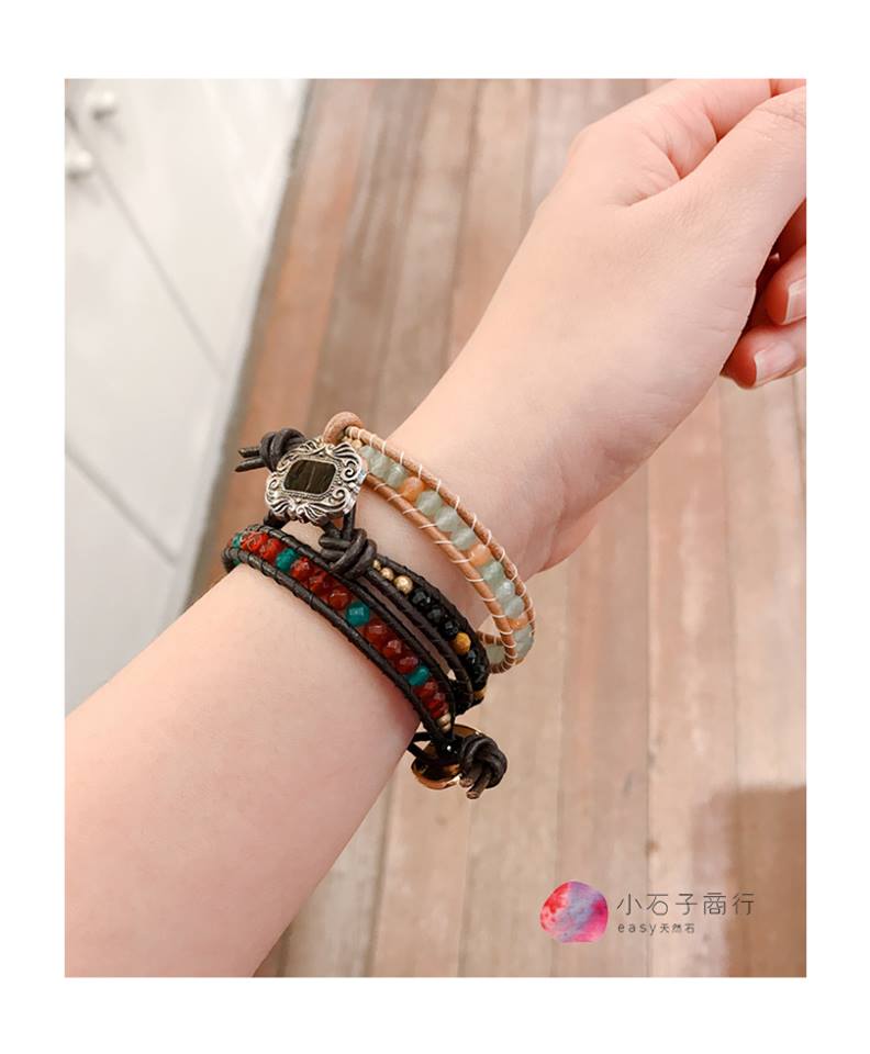 以皮繩為支架,學習編織技巧把天然石加入其中,再配上一個精緻的鈕扣,不會太甜膩,也不會太過粗曠,有點帥氣的妳,最適合這樣的完美融合!就像雅典娜女神充滿力量!和其他材質手鍊或天然石飾品一起搭配,更具風格。
