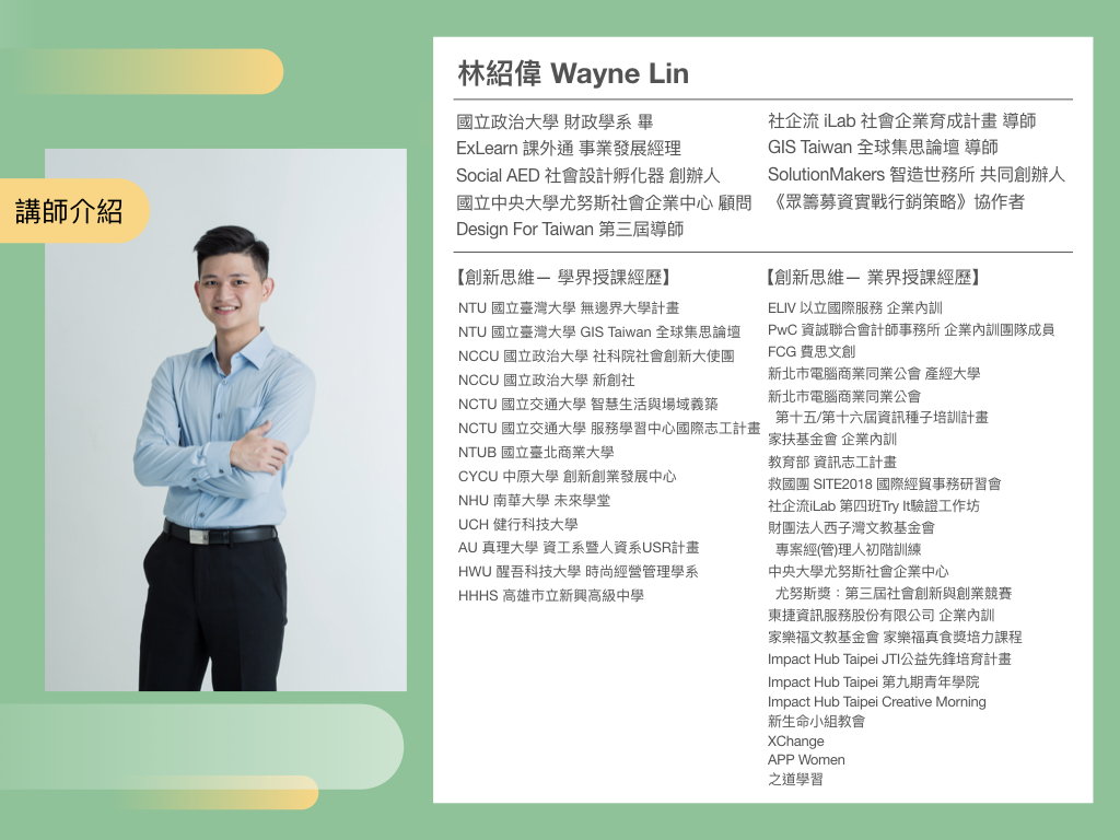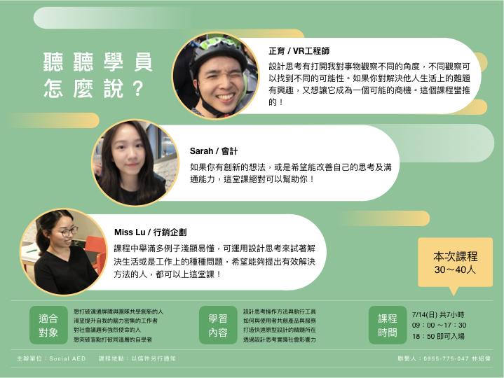 什麼是社會設計呢?在我們的見解中,為創造正面社會影響力而付諸的一切行動,不管是硬體、軟體、服務、甚至是商業模式,都是一種社會設計,而設計思考便是將其實踐的有效方法之一。如果你需要做出改變、如果你的團隊需要成長、如果你想了解如何開始創新,這堂課將能帶給你全新的視野!