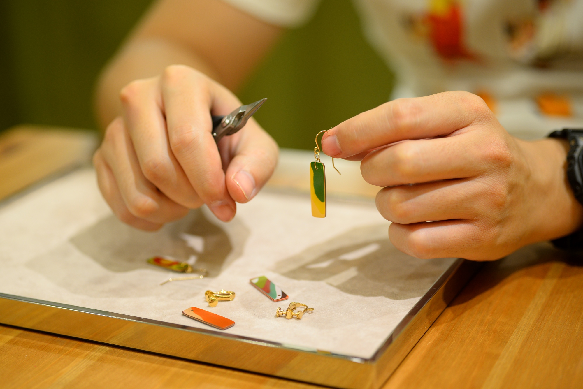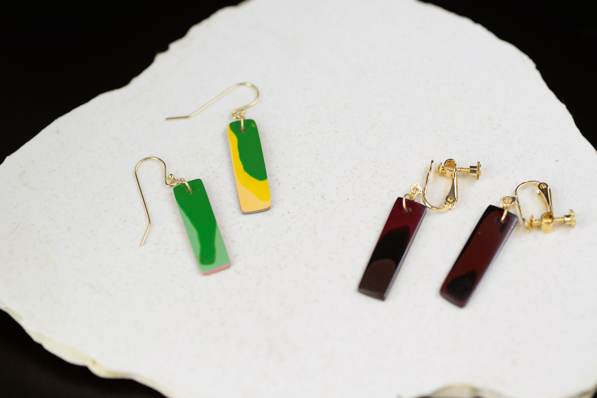 以「漆」為唯一原料,不同色彩一日一層堆高的的漆板經過切割研磨後,形成如同玉石般的硬度與美麗色澤,在極小的方塊內,就能展現極多的色彩。課程由學員挑選喜歡的漆石,研磨出想要的圖案和形狀,再將完成的漆石串成耳飾,亦可選擇製作夾式耳環。